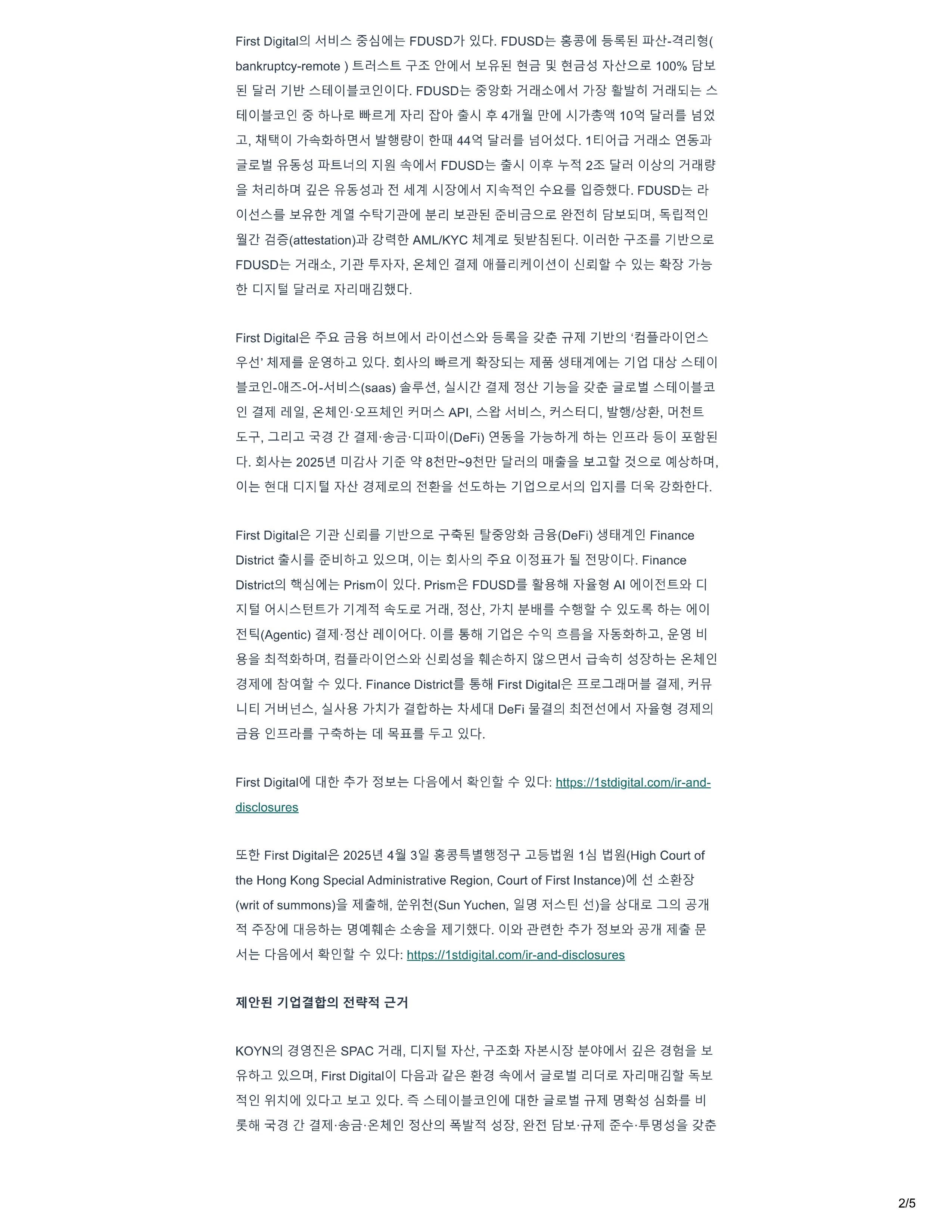 F i rst Dig i tal A i 1::11 , g Ol l - e FDUSD7t q . FDUSD - E , 8 0 I I - † - 'El .II/ - H - 2.l! I ( bankruptcy - remote ) . † .2 . i . † . ;i OII A i .s!. - R -- S - a - - a - ii JCtH2£ 100% 8 " .s!. 2 /5 @ cl }I'll" E 1 1 0 1 5:!.<2.101 q . FousDe ,g li211 “ <>1 1 A 1 7t ol l - 1211£ 1 - e EJIO l 5:!.<2.! 5•Lt£ 111t.sJll xt2 . 1 ot Al $ 4}H'f!! Oii Al7t QJI 10Qj cl 'a S?t j]_. lfill OI 7t i' l .. A i ieJ'OI !QI 44Qj cl 'a<>i q , 1 El<>i - a l - 1211 “ '2!.g_jJ_t Al OI - 'f - 2 cl O l .21 l - J211ia' £ - R - % .II/ - . † .l=t Dj .g - R - .g Xlf:! <>I I A i FDUSD - E <2.! + R 1::11 - a - 2£ ff i D - E ol 8".!i!.£1 Dj, - &El C2! 01 * .!i!..ff. ) I I ?'97lt!!"OI I {E2 . l .!i! . @ ill! - ( attestation ) .i!I - AM U KYC ; 1 1 ; 1) 1 1£ @q_ 0 1 2:J T 7l'll ƒ 2£ FousD - e lic!fl “ . 71 - £1 - !j.7 - txL g .A i 1 C2J 1 1 ou 2 . 17 1 101 - t::101 i ! £J W - + . . e 1 m 7t"5" q 7 q 'i1 "gcl£ JCt2 . 1 orn q . F i rst Dig i ta l . g - ?R - a -- 8 - oj.!:!.<>II A i 2.tOl 2t - † - s!" iTJ; :1 1 } I 'll - 2 1 · 2.tOI£! [fjif E i lOI .5i! - · l l i l 5 jl 2L q . .2 . I N .21 Ui t .sJ l l £1 - E Jql EH ) ! IOll - e 71 5:!.42! - 0H - Oi - A i l::l l (saas) ti. 11All! - 42! - ?1!Jql el l . . g l42! · .2. E l42! Dj AP I , J ; 1 : 1 'aH }1"5"£ s!" £ E i lO l 5:!. A 11::11 . E i q, tiJ".e - , Dj £T, .:1.2.ljl l! - l i l · 'S' - a - · CIII.1 - 0l ( DeFi ) 121.g£ }t"B" i 'l JJI i'l•e 42!.!! .go1 €! q , At - e 2025't:! D l At 71 QJ' 8f ! - 9f!'t! ƒ 'g2 . i .21 DH .!;:! _ j]_ 3;!2£ Oll tDI. 01 - e cH qx 1 'i1 7 - tH ?sl - 1 1£ 2 1 ei - ,a. .£at - e 7 l 2 £ A 1 JCI c 1 q . F i rst Dig i ta l .g }1 - £1 - i!£! 7 1 'll - 2£ T 'El ,g - a - .g. ( DeFi ) EH ) l l42! F i nance District Al.;. l::lli' l j]_ 2L2DI, Ol - e At - ?R Ol'alE.7t - iii 'ltOI q , F i nance District Olle PrismOI 2L q . Pr i sm.g FDUSD it Jet Al OIIO l . † . !i!.t q 7 - l'il OiAl 'E! 7t 71) 1 1 .££ l - 1211. 'at l. ;1t;t1 1::1H + w - + 2L£ i!i•e o i 101 sl( Agentic ) Jql - H cJIOI O i q , 0 1 - e - H ; 1 1 . g +QJ - g xt% t.J!, .ff 2l 1::11 * ,a. tstDI. 2.to1 21 - i ! . s ;lii 11 atx1 PJ£1!! A 1 - a a 1 i i a• - e .g . 1 42! JqlOJI - eJ - Oj w - + q , F i nance D i str i ct.;. ,e - tH F irst D i g i ta l e .!!£.: L HDi l i l. i} L I El lil::IJ \ : ! . At - † - 7t;tl7t ah ;tt A i lCH DeFi - ?1!2 1 O I I A 1 JC t !I l i l.21 disclosures ! £ F i rst D i gita l . g 2025't:! 4i! 3 ,8 - @ T .J! - † - 1 {I (H i gh Court of the Hong Kong Spec i al Adm i nistrat i ve Region, Court of F i rst l nstance ) OII “ .et (wr i t of summons)£ A i l . 51 - l ( Sun Yuchen, J C i - ? Oii c u ?Ste 0 1 1 " 1 1 “ - * Ail7l q . 012.t - a - )£ iJ" [ H£ .:L t P H 9}t .!i!.21 - . 1 H 1q1 A i - E - q gOJ I A i 42! + S?J.q : httris : //1stdigital.com/ir - and - di sdosures KOYN ? H H J.g SPAC l i c!fl. Cl7 - I Je t . T “ 7 - H ·AI - N O O I I A i .g ? f .!;:!. - H - o jl 2L20I, F i rst D i gita l DI q g i!.t . g :@ OII A 1 £ 2.1 C:1£ JCt2 . 1arn - &.!i!. ¥J;t1 o i 1 qj]_ .s! _ j]_ suet. E 1 1 0 1 5:!.42!<>11 cH £'i!!. iTJql 1::11 off l! - l·'S' - a - · - 8X i l 'at l 5!1 - & i i . 8".s!. · i= r I + · i i £ s!"
