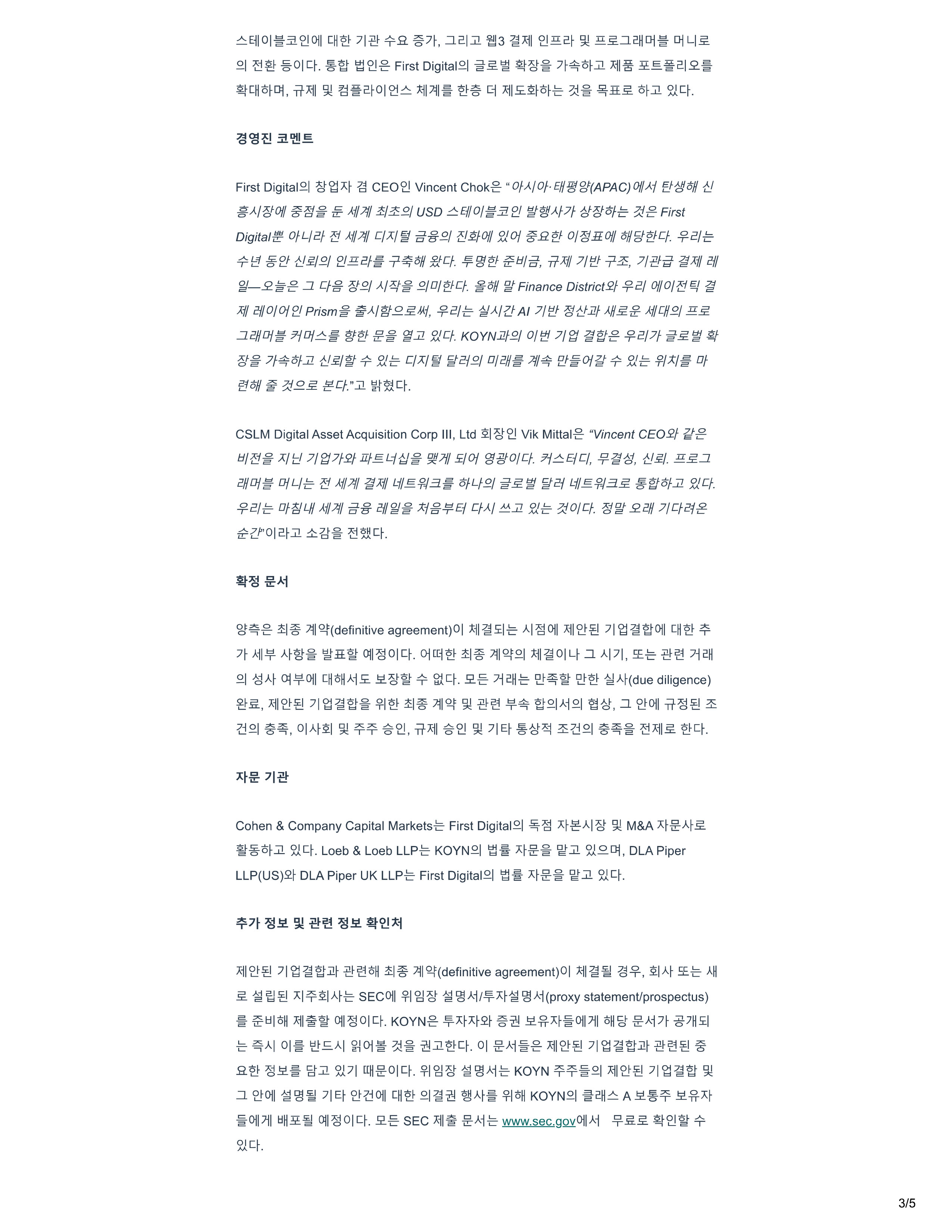 E 1 IO l 31 OJI C:H 71 - E \ - "i'=R 7 • .:J.2.ljl 3 Jql 3 /5 2. 5 . .:J.2ft at Di L I£ F i rst Dig i tal£! A CEO V i ncent C h okg " Of.A./Of·E/1 - WSt ( A P AC ) OI.A.j ff "hf ( ti 8 - J../t/Ol 8fJ£ !£ - ) #7{/ 1: / E/ USD f/10/ f!! 'e ! .A./7/ H f ofE ?.f..g First Digital Of L/i!f ) . Q7{/ C/ A / 19 - a - † E/ S : † IOll 5!1.0f ..fl O/fi.JIOII "6/ ( g , q_ - ¥ - 2/ - e ?'tf - † - P! tf.f/E/ f!!.!!i!.fg - 1 - "hff fief. 1F - 'i!/ HJ - a - , itX/17/'!f - 1 - 35 . , 7/Ef - g !/ Af 2/ - ! 2 .g .:J. NE/ .A.Jo{ EJD/ ƒ f!Cf. £o/l Finance District!l/ - ¥ - 2/ Of/0/ 1 † / ?I X/1 O/Of f!! Prism g.A.{ E..£1,t/, - ¥,i!/E .A.llf Al 7/'!f fit!J!/ ).//.£ ,{i, J . Qr/lE/ .! ! .£ .: 1 . i!/ 10 / ti 7 f i!!a/f ?(D j g {£ - † 2 J?iCf. KOYNJ!/E/ 0/'t! 7/ g/ !f"gf.g - ¥,2j7f .£.'i/ of2 ti£/ ? !i?lE C / A / 'gi!:/E/ 0/i!J/ 7{/ P ! OfY ? !i?lE - ¥ / X/ O f - ?;!E..£ q . - j]_ ct. CSLM Digital Asset Acquis i tion Corp Ill, Ltd Vik Mittalg "Vincent CEO!l/ u .g H/ A/f::! 7/'EJ 7 f!l/ 1If. † .L4 7/ 1 £/Of </J † "O{Cf. 7/ E/ r::/, .!jl?JiJ, tf .f / . .!! . .£.:1. i!/10/ Df L/ - e J . f P ll ?J X/1 Lj/. † .f./3.M of LfE/ .£.'I# 'iii!:/ l:f/. † .f./3. .£ 't/ of2 5'.fq_ .!f.i=/E D f L// ) #7{/ B" † † ;; t f † lf! - E/ q .A.J 2 fLE - ?;!0/Cf. fj .!i!.i!/17/qi! - {!! J?l.1"012 . j]_ “ it tt q , g .!I 7' 11 2l'{defin i tive agreement)Ol 1<!11!!£ 1 e Al Oll Ail£!€! 7 1 1!!ru - Oll Cff 7 AH¥ A 'it.IE.ti" o u 0 1 ct. oia : 1 . ! l P HQJ=. 2 1 1<11 01 L .:J. Al71, .!Ee r1211 A 01¥0!1 Cff of l A .!i:. .!i! . W "i'= W.c t . .5!. - † r J 211 - e '2. t W 121 talAHdue d i l i gence) . JqleJ -- 8 71 :a.21 . CIA .!! Jll21' i ! 'fl - ¥ ru - £1. > .. • .:J. el"OII i t - 8 Ail£ q . ' % . it}ql '% 7IE :a£J Cohen & Company Cap i tal Markets - E - F i rst D i gital A ,e.AI M&A A . g N £ !! - %<' > jl q. Loeb & Loeb LLP - e KOYN£! - a - J : .g jl .2.0j, DLA P i per LLP ( US ) .2 DLA P i per UK LLP - e F i rst Digita l . 2 1 \ !;lffo J:tg 'i [ j]_ q. : X 1 1 e!" 71 j!j - tl - ofl .! I 7' 1 12!'{definitive agreement)OI 1 - f;! . I N - e J.11 £ 'El€! J:l I A - e SECOII ¥1 * l:ll Jql orno1 q . KOYN.g 'i!l A / · ! P 'i!l A (proxy statement/prospectus ) J:t A 2t i:! .!i!.{fJ: Oll}!I 'a" g ;.. 7 7 H £1 E Al 01 E.AI ilOI i:!j l q . 01 g A f g Ail£ ! . † 7 1 gi - ru - .] ii1@ .g B. !i! @j]_ 71 !QlgOlct. ¥1 A - e KOYN 2 1 1£1"@ 7 l ii!ru .:J. el"O I I - ';! 7 1 Et eJ - :aOll EH 2 1 - l! At 5?1 KOY N . 2 1 211 A .!i!. - 8 - ? !i ! {fJ: Oll} ! I l l H o m OI c t . .5!. - † SEC Jql g A i - e www.sec. go v 0ll A 1 .!:j!s.£ q. "W "i'= 6 jl Ail 2.l.2. i rst D i g i tal£! £ It 7 g F - g - ol q . IE.£ o jl q. 1<11 7' 1 1 * C=I Jql.!i:. † 1 - o e 2 . 01 c:H<'> Dl. ;tJql
