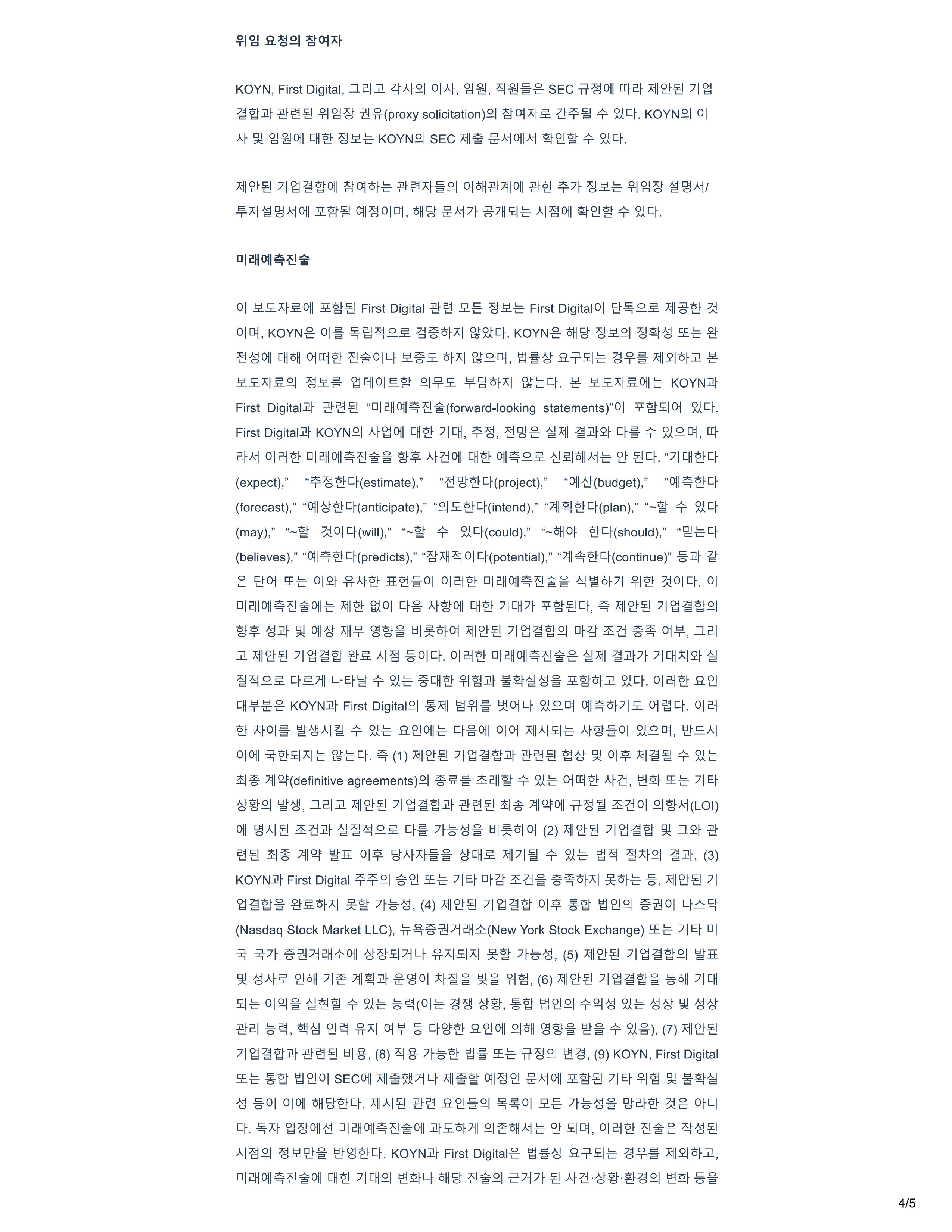 KOY N , F i rst Dig i ta l , .:::1.2 . lj ! ztA • .2.1 OI A •• 2:lf:!, 4 /5 .g SEC i t O I I er g . I @ 7 1 gj .ill - @ ¥1 i ! OII CH f} (proxy so l icitation}.2.1 :ei - o p ; : •£ - D.,Sil "r' 5U. q , KOY N .2.1 01 .!i!.e KOYN£1 SEC l i l .g. A 1 0 I I A 1 i! - £111 "r' 5U. q , N l i @ 7lgj e o 11 :filO j o•e i c P : • £1 01 7"1I O II - E m 9 - 7. .!i!.e ¥! A 1 / · ;i;;· A 10 J I il O H ! OI Oj, off @ A P• t P H - E - Al OJI CZ! "r' 5U. q , OI .s!.£;J;; . E O I I . † F i rst D i gital el - .!i!.E .!i!. - E - F i rst DigitalOI 8 - .2.£ l i l O I DI. KOYN.g 0 1 .. O U Cff i!iH OICEI .2.£ o . ;i;;I p. J q , KOYN.g @ .s!..2.1 - .!E. - E - - @! 01q .s! . £ o•;i;;1 Bf.2.DI, * '21' RT. £ 1 - E 5i! - l.2l o . j! . s! . £ 7 i : E I . s! . EJIOI . † . 21 ¥£ ¥ @ o . 7 i : I Bf - E - q . . s! . £ 7 ' EO I I - E - KOY N . l!t F i rst Digitalj! • ic : ! 0 1 c!fl 0 1 1 ( forward - l ooking statements ) "OI W' . £ 1 0 ! 5 U . q , F i rst D i gita l . l!t KOYN . 2 . 1 A . gjOJI CH 7 ICH, ? . w . g l i l . i!l - . 2 . q "r' 5 U .. 2 . 1 Jj, rrt 2 .• A 1 0 1 2 : 1 0 1 c!fl 0 1 1 W . $ - N ? :: !OII cH 0 1 1 . 2 . £ i ! £ 1 . 1 . 1 .. e ,B q . 7 1 cH q ( expect}," · 9 - q ( estimate ) ," · i :: t ( project}," " 0 1 1 tl' ( budget ) . " " 0 1 1 q ( forecast} ," " 0 1 1 q ( antic i pate}," " 21 £ i :: t(i ntend ) ," "Jllll q ( plan} . " · - "r' 5 U . q (may) ," · - w 0 1 CHw i ll) , " · - w "r' 5U. q (co u l d) , " · - O q ( should}," · ,eq (believes) ," "0 1 1 CHpred i cts )," · O I q ( potentia l )," "J l l CHcont i nue) " % .ill - .g 8 - ot .!E. - e 01 - H - Ne! - B. 01 0 1 2:1e1 - 0 1 c!fl0 1 1 <!al 'l!!.o•71 ¥lei - 0 1 q . 01 0 1 c!floi 1 0II - E - l i l 01 q g A•w<> 1 1 cH 7ICH7• w - s q , I D· li @ 7lgj e.2.1 ?::! .g 01 ¥ . .:::1. 2.1 "ti'.$ - i'lj ! . Oii XH - 'f - 1:11 0•01 l i S 7lgj j! l i @ 7 l g j e - @! - E .1...1 % 0 1i::t. 01c1 01c!fl0 1 1 .g x - i 1 .i!l - 7• 7IC H AI o•j! su_q_ 0 1 2:1 RCZ! .2.DI O ! l o Pl.!c. ot i::t. 0 1 2:J .2.£ q Jtl q E• "r' S U E cH .ill - Cff ¥ .g KOYN.i!I - F i rst Dig i ta l .2.1 l i l 'e l ¥! OIL/ - :1 - •01 Al "r' e R<2!0lle qg o n 0101 l 1 IA l e A· OI .2.DI, 'l!'.EAI 1 "r' 5U. - E .!E.e 7 1 E• 010 1 1 £ 1 7' 1 - E - Bf - E - q . c1> x 1 s 7l gj ej ! • "f! - s 'l! 01 J I IQf ( definitive agreements}.2.1 E W - "r' 5U. - E - OI c c - J A•?:!. w.2.1 • .:::i.2 . 1 j! Xi @ 7lgj ej ! • t!! - ic! - 'El JJl2l'O I I it ?::! 01 £ 1 W A 1 (L o 1, OJI Al@ ?:Jj ! • .2.£ q ,. 7•'5" 1:1 1 a•01 (2) l 1 1 S 7lgj .:::i..2• @ £ 1 J I IQ/' Wll 01 @ N :,;:· - MCH£ l 1 171 "r' 'E KOYNj ! . F i rst Digital .,S.,S£1 g<2! .!E. - E - 7IE. om ?::! .g · ;i;;I A · .2.j .ill - . (3) · - E - %. Xi i @ 71 '2121 iJol q gj - @! - Eo•Ji:I W - 7•'5 " . (4) X i i 7lgj 01.$ - (Nasdaq Stock Market LLC ) , - 'fi - i J 7 - j i!I I “ (New York Stock Exchange ) .!E . e 7 I E . DI 7 ,g · P i c!fl “ Oll £ 17 - J q f:.7i:l 7i:I 7 '5 ' . (5) l i @ 7l e21 WJ “ A £ ' 21 71 - e Jll .; j . i!I - 2 tOI A E OIQJ w "r' E is ( OI - E - 2 . l ' 5 ' , ' 2 ! f :.; J ;; I 01 ¥ % q !ii! . (6) 1 €! 7lgj 7ICH it. w '2!21 "r'QJ - E - i'lg i'lg RCZ!Oll 21 'l!W 'EJ' "r' ). (7) l i @ 71 ?i!Wj!• ic!@ 1:11%, (8) % 7 · '5" 'E!l. Ef - E - i t .2.1 . (9) KOYN, F i rst Digital @ 7I E . ¥! .!E. - E - '2!01 SECOJI l },j L . l i l orn'2! A i O I I OI OIO I I - etl'2l' CL l 1 I AI€! - fl - R .2.1 OI .!i!.E :, '5' 2 . · .g O LI q , &Ji:• Ollt'! Dlc!flOl l B O I I j ! £ . Jtl .2. l off A 1 - E - DI. 0 1 2:1 .g @ Al .2.1 .s!.'2! eJ, q . KOYNj ! . F i rst Digita l .g - RT.!cl - E - - '.35i! - l 1 1.2J · j ! · Dlc!flOl l B OII CH 7ICH21 q off @ £ 1 - 2 - 7 - m @ A R ! W· .2.1