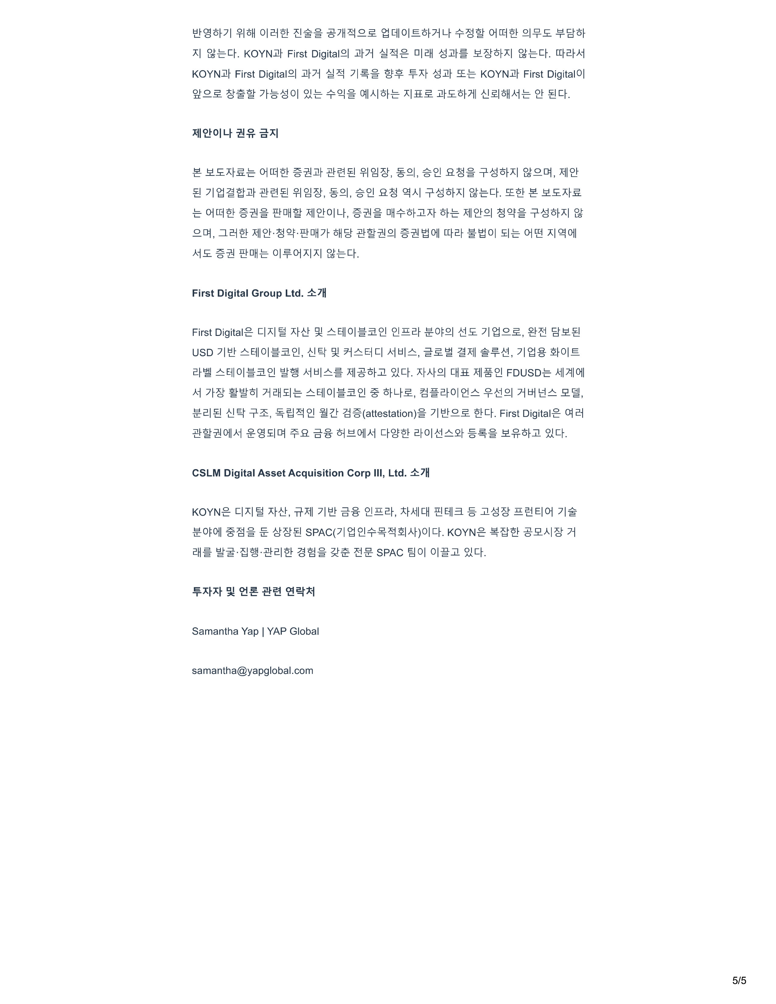 l ! i 71 ¥!t i H 0 1 2 . f . 1 - 5 /5 7H .2.5. gj [ · U Ol † . l! i . }i4 - ? m - Oj iraj 1 ¥£ ¥ - @l!i• J : I PJ - e q . KOYN.i!J - F i rst D i g i tal21 .i! 7 - i KOYNj!t F i rst Dig i ta l 21 .i!t7 - J 1! 71 .g. Dl211 W :X:t .i ! · .!i! . 6 . AI PJ - e q . [Q - 2./ - A i .i!t - E - KOYN.i!t F i rst D i g i ta l OI w - .2.5. m - 7 • {901 - e ?Q.J 0 1 IA1a• - e A I H.5. .i!J - £l!i•} J 1 6'1 A 1 - e '2! - aq_ .!i!.£Ats. - e oJ r r f ! - iS"'t:l.i!I - - Et ¥i m . - e - 2 1 . '5''2! .2 T 6•A1 PJ.2.at. l l l'2! - 8 71 .i!I - a ¥! . %21. '5''2! .2 Q!AI T ts•A1 PJe q . - E - .!i!.£:x:ts. - e 0J r r 1 .g. - z1 l!!anm - l l l'2! - 0l4 - . iS" ƒ l:! aH ?l!it.:i!J:t ete 1 '2! - 21 Qf T etJ:I PJ .2.at • .:i . fil l l l'2! -- Qf - 1t1 - aH7t 6flg W't:!21 't:!igio i 1 cq - 2.t igio1 £le ot't! J: 1 21<>11 A . 1£ .g.'t:! it! - DH e 01 . o p : 1:x:1 PJ - e - q_ F i rst D i g i tal Group Ltd. “ JII F i rst Dig i ta l .g. qJ : I Att!" USD 71 EllO l .:1!'2!, 2.t E i lO l 5i'2! A i l::tl Ell O l .:i ! '2! '2!B.2.t 0 21 i"!£ 71 2.5., - @! - † .!i!.,8 ? j Ejq A i 1 ::t . " † " 5. I 1 6 .:i! q - :X:tAt21 [ HH. l l · 71 - 3 0 1 † . '2! FDUSD - e - AilJ I IO I I A i 7t W - l! i l }i 2.H£1e Ell 0 1 .: a '2! .g l!it4 - 5., 2.to 1 2:16 - Sj! - i"!21 } i l::ll \ :! .2 . ill, 2 . I - El T3!:, '2! f W · - el ( attestation ) - a - 71 2.5. q - F i rst Dig i ta l .g. DI - t! - W - zl<>II A i £1Dj .2 E ol..!:!OII A i q2,t 2.tOli"!6 2t % .!i! _ {f 6 .:i! q - CSLM D i g i tal Asset Acqui s i t i on Corp Ill, Ltd. “ JII KOY N .g. Cl:X:I :X:tt!", u I 71 - a - * '2!B.2.t, J;tJ. . 1 11:fl 1c! Ell.3. % .:i! B.ic ! E l OJ 71 0 0 11 .g ff" @ S P AC (71 '2!? At ) OP : t. KOYN.g. .2.AI 7 - i 211 - · - tf 2.I g SPAC E!OI O l _j]_ q - Samantha Y ap I YAP Global samantha@yapgl oba l. com