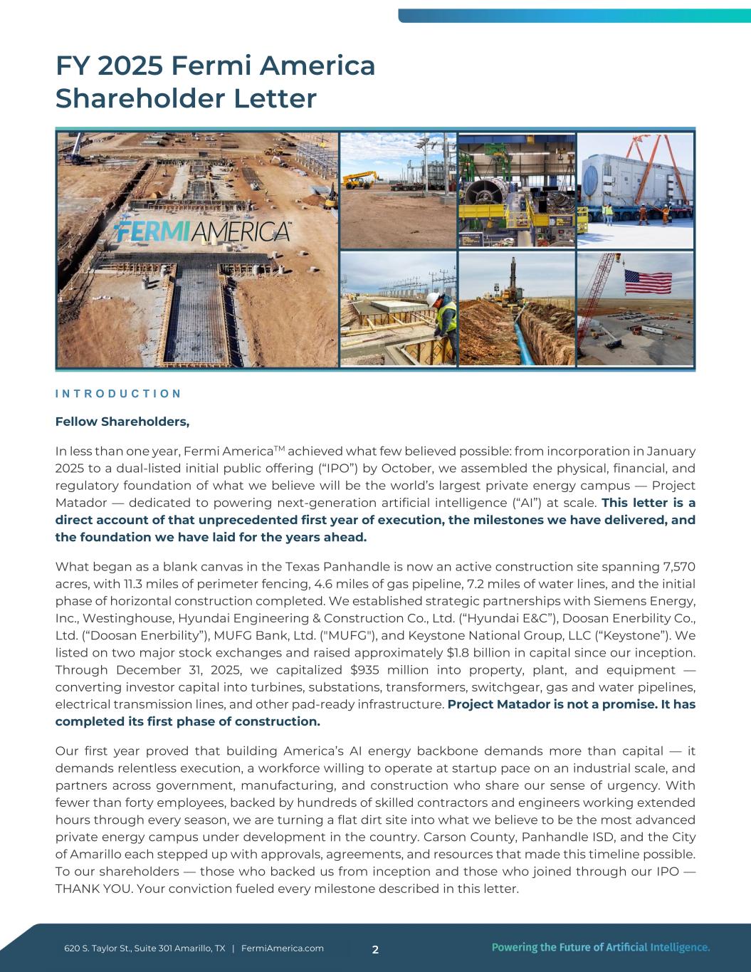 2 620 S. Taylor St., Suite 301 Amarillo, TX | FermiAmerica.com FY 2025 Fermi America Shareholder Letter I N T R O D U C T I O N Fellow Shareholders, In less than one year, Fermi AmericaTM achieved what few believed possible: from incorporation in January 2025 to a dual-listed initial public offering (“IPO”) by October, we assembled the physical, financial, and regulatory foundation of what we believe will be the world’s largest private energy campus — Project Matador — dedicated to powering next-generation artificial intelligence (“AI”) at scale. This letter is a direct account of that unprecedented first year of execution, the milestones we have delivered, and the foundation we have laid for the years ahead. What began as a blank canvas in the Texas Panhandle is now an active construction site spanning 7,570 acres, with 11.3 miles of perimeter fencing, 4.6 miles of gas pipeline, 7.2 miles of water lines, and the initial phase of horizontal construction completed. We established strategic partnerships with Siemens Energy, Inc., Westinghouse, Hyundai Engineering & Construction Co., Ltd. (“Hyundai E&C”), Doosan Enerbility Co., Ltd. (“Doosan Enerbility”), MUFG Bank, Ltd. ("MUFG"), and Keystone National Group, LLC (“Keystone”). We listed on two major stock exchanges and raised approximately $1.8 billion in capital since our inception. Through December 31, 2025, we capitalized $935 million into property, plant, and equipment — converting investor capital into turbines, substations, transformers, switchgear, gas and water pipelines, electrical transmission lines, and other pad-ready infrastructure. Project Matador is not a promise. It has completed its first phase of construction. Our first year proved that building America’s AI energy backbone demands more than capital — it demands relentless execution, a workforce willing to operate at startup pace on an industrial scale, and partners across government, manufacturing, and construction who share our sense of urgency. With fewer than forty employees, backed by hundreds of skilled contractors and engineers working extended hours through every season, we are turning a flat dirt site into what we believe to be the most advanced private energy campus under development in the country. Carson County, Panhandle ISD, and the City of Amarillo each stepped up with approvals, agreements, and resources that made this timeline possible. To our shareholders — those who backed us from inception and those who joined through our IPO — THANK YOU. Your conviction fueled every milestone described in this letter.