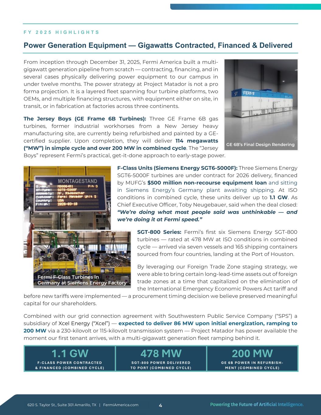 4 620 S. Taylor St., Suite 301 Amarillo, TX | FermiAmerica.com F Y 2 0 2 5 H I G H L I G H T S Power Generation Equipment — Gigawatts Contracted, Financed & Delivered From inception through December 31, 2025, Fermi America built a multi- gigawatt generation pipeline from scratch — contracting, financing, and in several cases physically delivering power equipment to our campus in under twelve months. The power strategy at Project Matador is not a pro forma projection. It is a layered fleet spanning four turbine platforms, two OEMs, and multiple financing structures, with equipment either on site, in transit, or in fabrication at factories across three continents. The Jersey Boys (GE Frame 6B Turbines): Three GE Frame 6B gas turbines, former industrial workhorses from a New Jersey heavy manufacturing site, are currently being refurbished and painted by a GE- certified supplier. Upon completion, they will deliver 114 megawatts (“MW”) in simple cycle and over 200 MW in combined cycle. The “Jersey Boys” represent Fermi’s practical, get-it-done approach to early-stage power. F-Class Units (Siemens Energy SGT6-5000F): Three Siemens Energy SGT6-5000F turbines are under contract for 2026 delivery, financed by MUFG’s $500 million non-recourse equipment loan and sitting in Siemens Energy’s Germany plant awaiting shipping. At ISO conditions in combined cycle, these units deliver up to 1.1 GW. As Chief Executive Officer, Toby Neugebauer, said when the deal closed: “We’re doing what most people said was unthinkable — and we’re doing it at Fermi speed.” SGT-800 Series: Fermi’s first six Siemens Energy SGT-800 turbines — rated at 478 MW at ISO conditions in combined cycle — arrived via seven vessels and 165 shipping containers sourced from four countries, landing at the Port of Houston. By leveraging our Foreign Trade Zone staging strategy, we were able to bring certain long-lead-time assets out of foreign trade zones at a time that capitalized on the elimination of the International Emergency Economic Powers Act tariff and before new tariffs were implemented — a procurement timing decision we believe preserved meaningful capital for our shareholders. Combined with our grid connection agreement with Southwestern Public Service Company (“SPS”) a subsidiary of Xcel Energy (“Xcel”) — expected to deliver 86 MW upon initial energization, ramping to 200 MW via a 230-kilovolt or 115-kilovolt transmission system — Project Matador has power available the moment our first tenant arrives, with a multi-gigawatt generation fleet ramping behind it. 1.1 GW F - C L A S S P O W E R C O N T R A C T E D & F I N A N C E D ( C O M B I N E D C Y C L E ) 478 MW S G T - 8 0 0 P O W E R D E L I V E R E D T O P O R T ( C O M B I N E D C Y C L E ) 200 MW G E 6 B P O W E R I N R E F U R B I S H - M E N T ( C O M B I N E D C Y C L E ) Fermi F-Class Turbines in Germany at Siemens Energy Factory GE 6B’s Final Design Rendering