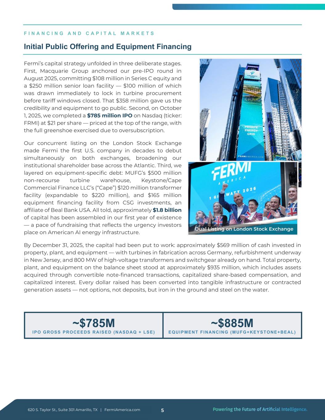 5 620 S. Taylor St., Suite 301 Amarillo, TX | FermiAmerica.com F I N A N C I N G A N D C A P I T A L M A R K E T S Initial Public Offering and Equipment Financing Fermi’s capital strategy unfolded in three deliberate stages. First, Macquarie Group anchored our pre-IPO round in August 2025, committing $108 million in Series C equity and a $250 million senior loan facility — $100 million of which was drawn immediately to lock in turbine procurement before tariff windows closed. That $358 million gave us the credibility and equipment to go public. Second, on October 1, 2025, we completed a $785 million IPO on Nasdaq (ticker: FRMI) at $21 per share — priced at the top of the range, with the full greenshoe exercised due to oversubscription. Our concurrent listing on the London Stock Exchange made Fermi the first U.S. company in decades to debut simultaneously on both exchanges, broadening our institutional shareholder base across the Atlantic. Third, we layered on equipment-specific debt: MUFG’s $500 million non-recourse turbine warehouse, Keystone/Cape Commercial Finance LLC’s (“Cape”) $120 million transformer facility (expandable to $220 million), and $165 million equipment financing facility from CSG investments, an affiliate of Beal Bank USA. All told, approximately $1.8 billion of capital has been assembled in our first year of existence — a pace of fundraising that reflects the urgency investors place on American AI energy infrastructure. By December 31, 2025, the capital had been put to work: approximately $569 million of cash invested in property, plant, and equipment — with turbines in fabrication across Germany, refurbishment underway in New Jersey, and 800 MW of high-voltage transformers and switchgear already on hand. Total property, plant, and equipment on the balance sheet stood at approximately $935 million, which includes assets acquired through convertible note-financed transactions, capitalized share-based compensation, and capitalized interest. Every dollar raised has been converted into tangible infrastructure or contracted generation assets — not options, not deposits, but iron in the ground and steel on the water. ~$785M IPO GROSS PROCEEDS RAISED (NASDAQ + LSE) ~$885M EQUIPMENT FINANCING (MUFG+KEYSTONE+BEAL) Dual Listing on London Stock Exchange