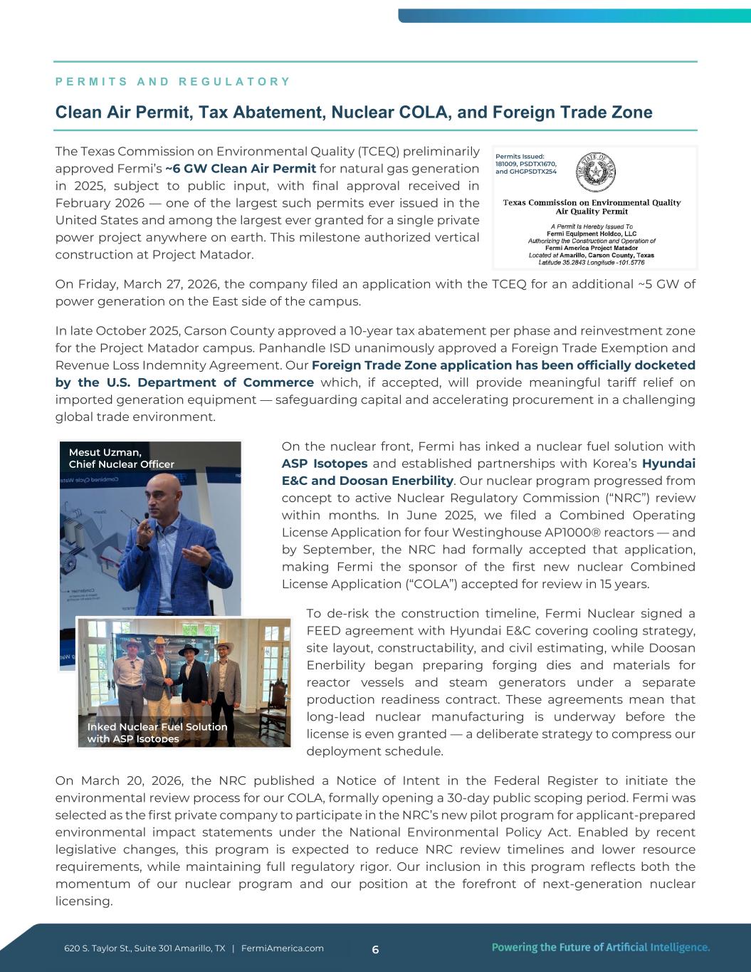 6 620 S. Taylor St., Suite 301 Amarillo, TX | FermiAmerica.com P E R M I T S A N D R E G U L A T O R Y Clean Air Permit, Tax Abatement, Nuclear COLA, and Foreign Trade Zone The Texas Commission on Environmental Quality (TCEQ) preliminarily approved Fermi’s ~6 GW Clean Air Permit for natural gas generation in 2025, subject to public input, with final approval received in February 2026 — one of the largest such permits ever issued in the United States and among the largest ever granted for a single private power project anywhere on earth. This milestone authorized vertical construction at Project Matador. On Friday, March 27, 2026, the company filed an application with the TCEQ for an additional ~5 GW of power generation on the East side of the campus. In late October 2025, Carson County approved a 10-year tax abatement per phase and reinvestment zone for the Project Matador campus. Panhandle ISD unanimously approved a Foreign Trade Exemption and Revenue Loss Indemnity Agreement. Our Foreign Trade Zone application has been officially docketed by the U.S. Department of Commerce which, if accepted, will provide meaningful tariff relief on imported generation equipment — safeguarding capital and accelerating procurement in a challenging global trade environment. On the nuclear front, Fermi has inked a nuclear fuel solution with ASP Isotopes and established partnerships with Korea’s Hyundai E&C and Doosan Enerbility. Our nuclear program progressed from concept to active Nuclear Regulatory Commission (“NRC”) review within months. In June 2025, we filed a Combined Operating License Application for four Westinghouse AP1000® reactors — and by September, the NRC had formally accepted that application, making Fermi the sponsor of the first new nuclear Combined License Application (“COLA”) accepted for review in 15 years. To de-risk the construction timeline, Fermi Nuclear signed a FEED agreement with Hyundai E&C covering cooling strategy, site layout, constructability, and civil estimating, while Doosan Enerbility began preparing forging dies and materials for reactor vessels and steam generators under a separate production readiness contract. These agreements mean that long-lead nuclear manufacturing is underway before the license is even granted — a deliberate strategy to compress our deployment schedule. On March 20, 2026, the NRC published a Notice of Intent in the Federal Register to initiate the environmental review process for our COLA, formally opening a 30-day public scoping period. Fermi was selected as the first private company to participate in the NRC’s new pilot program for applicant-prepared environmental impact statements under the National Environmental Policy Act. Enabled by recent legislative changes, this program is expected to reduce NRC review timelines and lower resource requirements, while maintaining full regulatory rigor. Our inclusion in this program reflects both the momentum of our nuclear program and our position at the forefront of next-generation nuclear licensing. Permits Issued: 181009, PSDTX1670, and GHGPSDTX254 Mesut Uzman, Chief Nuclear Officer Inked Nuclear Fuel Solution with ASP Isotopes