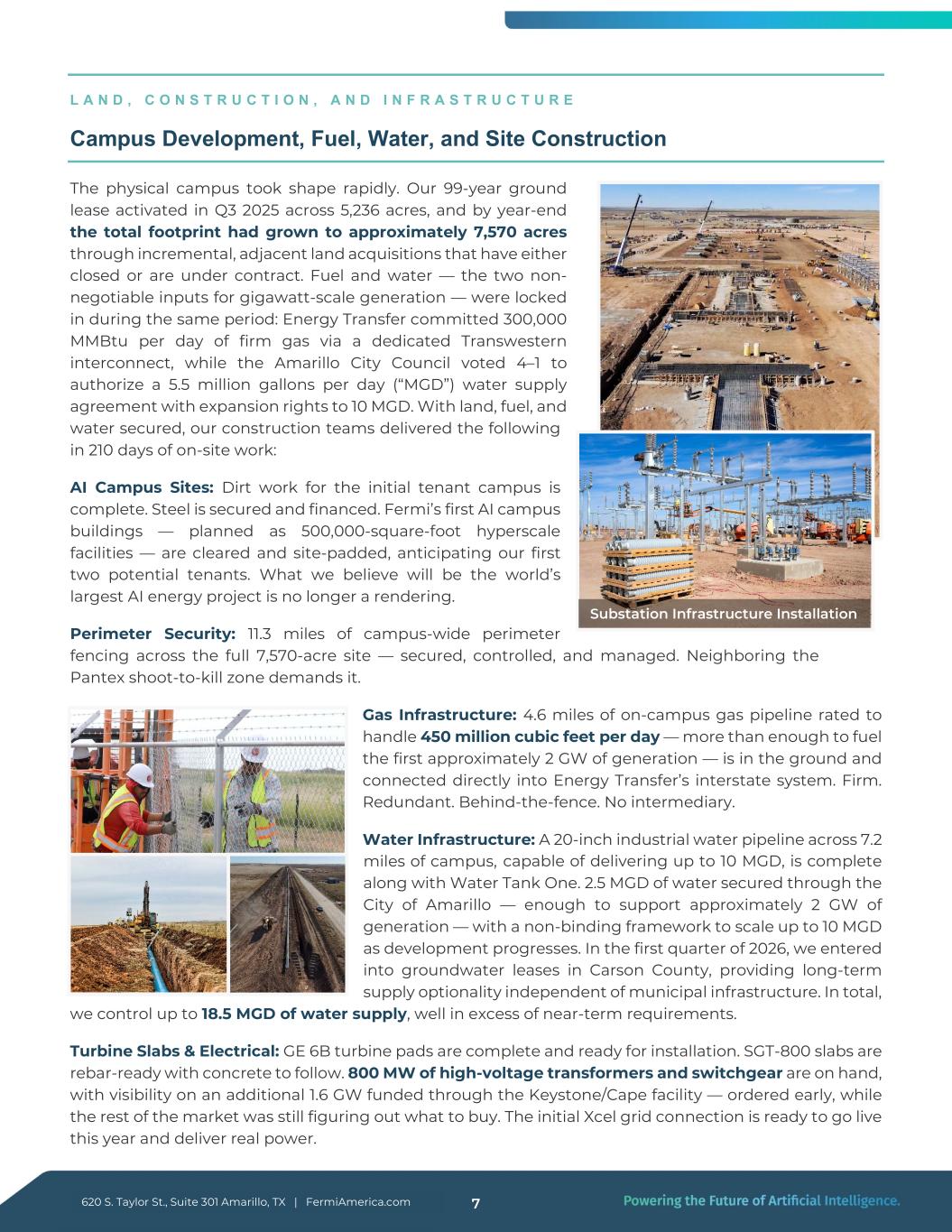 7 620 S. Taylor St., Suite 301 Amarillo, TX | FermiAmerica.com L A N D , C O N S T R U C T I O N , A N D I N F R A S T R U C T U R E Campus Development, Fuel, Water, and Site Construction The physical campus took shape rapidly. Our 99-year ground lease activated in Q3 2025 across 5,236 acres, and by year-end the total footprint had grown to approximately 7,570 acres through incremental, adjacent land acquisitions that have either closed or are under contract. Fuel and water — the two non- negotiable inputs for gigawatt-scale generation — were locked in during the same period: Energy Transfer committed 300,000 MMBtu per day of firm gas via a dedicated Transwestern interconnect, while the Amarillo City Council voted 4–1 to authorize a 5.5 million gallons per day (“MGD”) water supply agreement with expansion rights to 10 MGD. With land, fuel, and water secured, our construction teams delivered the following in 210 days of on-site work: AI Campus Sites: Dirt work for the initial tenant campus is complete. Steel is secured and financed. Fermi’s first AI campus buildings — planned as 500,000-square-foot hyperscale facilities — are cleared and site-padded, anticipating our first two potential tenants. What we believe will be the world’s largest AI energy project is no longer a rendering. Perimeter Security: 11.3 miles of campus-wide perimeter fencing across the full 7,570-acre site — secured, controlled, and managed. Neighboring the Pantex shoot-to-kill zone demands it. Gas Infrastructure: 4.6 miles of on-campus gas pipeline rated to handle 450 million cubic feet per day — more than enough to fuel the first approximately 2 GW of generation — is in the ground and connected directly into Energy Transfer’s interstate system. Firm. Redundant. Behind-the-fence. No intermediary. Water Infrastructure: A 20-inch industrial water pipeline across 7.2 miles of campus, capable of delivering up to 10 MGD, is complete along with Water Tank One. 2.5 MGD of water secured through the City of Amarillo — enough to support approximately 2 GW of generation — with a non-binding framework to scale up to 10 MGD as development progresses. In the first quarter of 2026, we entered into groundwater leases in Carson County, providing long-term supply optionality independent of municipal infrastructure. In total, we control up to 18.5 MGD of water supply, well in excess of near-term requirements. Turbine Slabs & Electrical: GE 6B turbine pads are complete and ready for installation. SGT-800 slabs are rebar-ready with concrete to follow. 800 MW of high-voltage transformers and switchgear are on hand, with visibility on an additional 1.6 GW funded through the Keystone/Cape facility — ordered early, while the rest of the market was still figuring out what to buy. The initial Xcel grid connection is ready to go live this year and deliver real power. Substation Infrastructure Installation