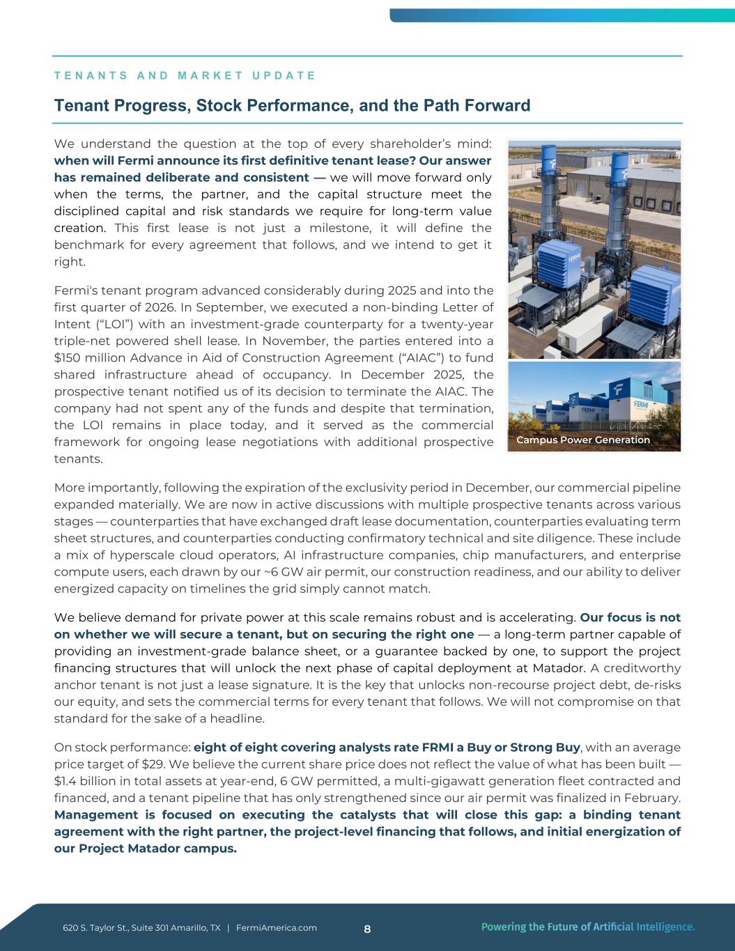 8 620 S. Taylor St., Suite 301 Amarillo, TX | FermiAmerica.com T E N A N T S A N D M A R K E T U P D A T E Tenant Progress, Stock Performance, and the Path Forward We understand the question at the top of every shareholder’s mind: when will Fermi announce its first definitive tenant lease? Our answer has remained deliberate and consistent — we will move forward only when the terms, the partner, and the capital structure meet the disciplined capital and risk standards we require for long-term value creation. This first lease is not just a milestone, it will define the benchmark for every agreement that follows, and we intend to get it right. Fermi's tenant program advanced considerably during 2025 and into the first quarter of 2026. In September, we executed a non-binding Letter of Intent (“LOI”) with an investment-grade counterparty for a twenty-year triple-net powered shell lease. In November, the parties entered into a $150 million Advance in Aid of Construction Agreement (“AIAC”) to fund shared infrastructure ahead of occupancy. In December 2025, the prospective tenant notified us of its decision to terminate the AIAC. The company had not spent any of the funds and despite that termination, the LOI remains in place today, and it served as the commercial framework for ongoing lease negotiations with additional prospective tenants. More importantly, following the expiration of the exclusivity period in December, our commercial pipeline expanded materially. We are now in active discussions with multiple prospective tenants across various stages — counterparties that have exchanged draft lease documentation, counterparties evaluating term sheet structures, and counterparties conducting confirmatory technical and site diligence. These include a mix of hyperscale cloud operators, AI infrastructure companies, chip manufacturers, and enterprise compute users, each drawn by our ~6 GW air permit, our construction readiness, and our ability to deliver energized capacity on timelines the grid simply cannot match. We believe demand for private power at this scale remains robust and is accelerating. Our focus is not on whether we will secure a tenant, but on securing the right one — a long-term partner capable of providing an investment-grade balance sheet, or a guarantee backed by one, to support the project financing structures that will unlock the next phase of capital deployment at Matador. A creditworthy anchor tenant is not just a lease signature. It is the key that unlocks non-recourse project debt, de-risks our equity, and sets the commercial terms for every tenant that follows. We will not compromise on that standard for the sake of a headline. On stock performance: eight of eight covering analysts rate FRMI a Buy or Strong Buy, with an average price target of $29. We believe the current share price does not reflect the value of what has been built — $1.4 billion in total assets at year-end, 6 GW permitted, a multi-gigawatt generation fleet contracted and financed, and a tenant pipeline that has only strengthened since our air permit was finalized in February. Management is focused on executing the catalysts that will close this gap: a binding tenant agreement with the right partner, the project-level financing that follows, and initial energization of our Project Matador campus. Campus Power Generation