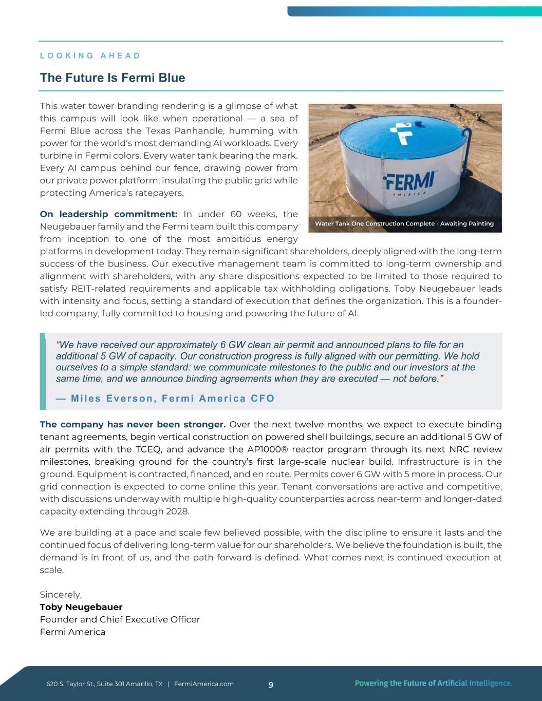 9 620 S. Taylor St., Suite 301 Amarillo, TX | FermiAmerica.com L O O K I N G A H E A D The Future Is Fermi Blue This water tower branding rendering is a glimpse of what this campus will look like when operational — a sea of Fermi Blue across the Texas Panhandle, humming with power for the world’s most demanding AI workloads. Every turbine in Fermi colors. Every water tank bearing the mark. Every AI campus behind our fence, drawing power from our private power platform, insulating the public grid while protecting America’s ratepayers. On leadership commitment: In under 60 weeks, the Neugebauer family and the Fermi team built this company from inception to one of the most ambitious energy platforms in development today. They remain significant shareholders, deeply aligned with the long-term success of the business. Our executive management team is committed to long-term ownership and alignment with shareholders, with any share dispositions expected to be limited to those required to satisfy REIT-related requirements and applicable tax withholding obligations. Toby Neugebauer leads with intensity and focus, setting a standard of execution that defines the organization. This is a founder- led company, fully committed to housing and powering the future of AI. The company has never been stronger. Over the next twelve months, we expect to execute binding tenant agreements, begin vertical construction on powered shell buildings, secure an additional 5 GW of air permits with the TCEQ, and advance the AP1000® reactor program through its next NRC review milestones, breaking ground for the country’s first large-scale nuclear build. Infrastructure is in the ground. Equipment is contracted, financed, and en route. Permits cover 6 GW with 5 more in process. Our grid connection is expected to come online this year. Tenant conversations are active and competitive, with discussions underway with multiple high-quality counterparties across near-term and longer-dated capacity extending through 2028. We are building at a pace and scale few believed possible, with the discipline to ensure it lasts and the continued focus of delivering long-term value for our shareholders. We believe the foundation is built, the demand is in front of us, and the path forward is defined. What comes next is continued execution at scale. Sincerely, Toby Neugebauer Founder and Chief Executive Officer Fermi America “We have received our approximately 6 GW clean air permit and announced plans to file for an additional 5 GW of capacity. Our construction progress is fully aligned with our permitting. We hold ourselves to a simple standard: we communicate milestones to the public and our investors at the same time, and we announce binding agreements when they are executed — not before.” — Mi le s Ev ers on, Fermi Amer i ca CFO Water Tank One Construction Complete - Awaiting Painting