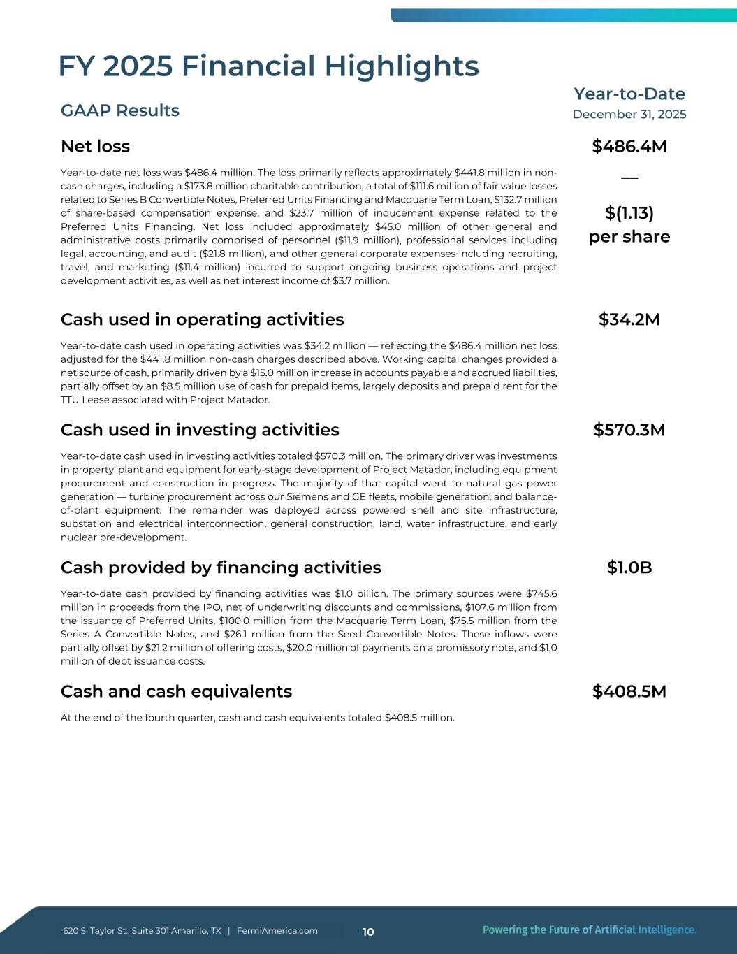 10 620 S. Taylor St., Suite 301 Amarillo, TX | FermiAmerica.com FY 2025 Financial Highlights GAAP Results Year-to-Date December 31, 2025 Net loss Year-to-date net loss was $486.4 million. The loss primarily reflects approximately $441.8 million in non- cash charges, including a $173.8 million charitable contribution, a total of $111.6 million of fair value losses related to Series B Convertible Notes, Preferred Units Financing and Macquarie Term Loan, $132.7 million of share-based compensation expense, and $23.7 million of inducement expense related to the Preferred Units Financing. Net loss included approximately $45.0 million of other general and administrative costs primarily comprised of personnel ($11.9 million), professional services including legal, accounting, and audit ($21.8 million), and other general corporate expenses including recruiting, travel, and marketing ($11.4 million) incurred to support ongoing business operations and project development activities, as well as net interest income of $3.7 million. $486.4M –– $(1.13) per share Cash used in operating activities Year-to-date cash used in operating activities was $34.2 million — reflecting the $486.4 million net loss adjusted for the $441.8 million non-cash charges described above. Working capital changes provided a net source of cash, primarily driven by a $15.0 million increase in accounts payable and accrued liabilities, partially offset by an $8.5 million use of cash for prepaid items, largely deposits and prepaid rent for the TTU Lease associated with Project Matador. $34.2M Cash used in investing activities Year-to-date cash used in investing activities totaled $570.3 million. The primary driver was investments in property, plant and equipment for early-stage development of Project Matador, including equipment procurement and construction in progress. The majority of that capital went to natural gas power generation — turbine procurement across our Siemens and GE fleets, mobile generation, and balance- of-plant equipment. The remainder was deployed across powered shell and site infrastructure, substation and electrical interconnection, general construction, land, water infrastructure, and early nuclear pre-development. $570.3M Cash provided by financing activities Year-to-date cash provided by financing activities was $1.0 billion. The primary sources were $745.6 million in proceeds from the IPO, net of underwriting discounts and commissions, $107.6 million from the issuance of Preferred Units, $100.0 million from the Macquarie Term Loan, $75.5 million from the Series A Convertible Notes, and $26.1 million from the Seed Convertible Notes. These inflows were partially offset by $21.2 million of offering costs, $20.0 million of payments on a promissory note, and $1.0 million of debt issuance costs. $1.0B Cash and cash equivalents At the end of the fourth quarter, cash and cash equivalents totaled $408.5 million. $408.5M