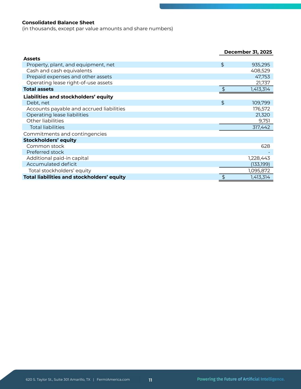 11 620 S. Taylor St., Suite 301 Amarillo, TX | FermiAmerica.com Consolidated Balance Sheet (in thousands, except par value amounts and share numbers) December 31, 2025 Assets Property, plant, and equipment, net $ 935,295 Cash and cash equivalents 408,529 Prepaid expenses and other assets 47,753 Operating lease right-of-use assets 21,737 Total assets $ 1,413,314 Liabilities and stockholders’ equity Debt, net $ 109,799 Accounts payable and accrued liabilities 176,572 Operating lease liabilities 21,320 Other liabilities 9,751 Total liabilities 317,442 Commitments and contingencies Stockholders’ equity Common stock 628 Preferred stock - Additional paid-in capital 1,228,443 Accumulated deficit (133,199) Total stockholders’ equity 1,095,872 Total liabilities and stockholders’ equity $ 1,413,314