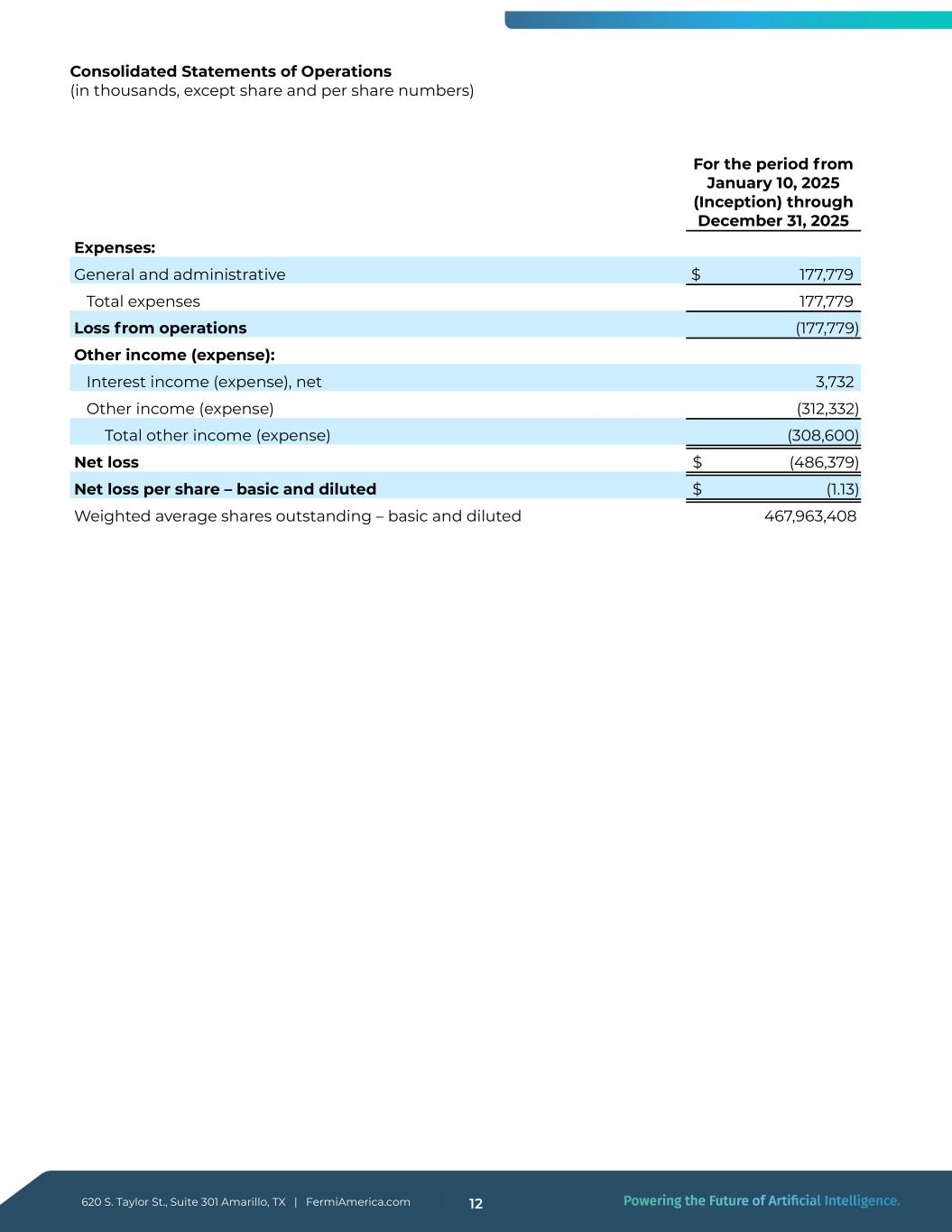12 620 S. Taylor St., Suite 301 Amarillo, TX | FermiAmerica.com Consolidated Statements of Operations (in thousands, except share and per share numbers) For the period from January 10, 2025 (Inception) through December 31, 2025 Expenses: General and administrative $ 177,779 Total expenses 177,779 Loss from operations (177,779) Other income (expense): Interest income (expense), net 3,732 Other income (expense) (312,332) Total other income (expense) (308,600) Net loss $ (486,379) Net loss per share – basic and diluted $ (1.13) Weighted average shares outstanding – basic and diluted 467,963,408