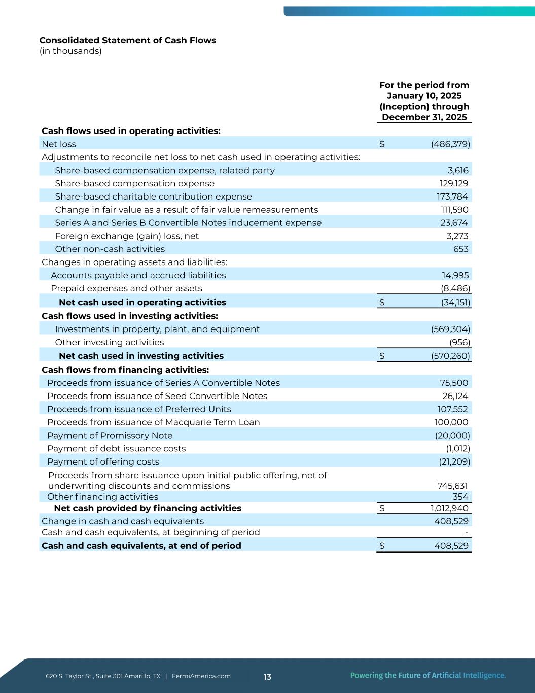 13 620 S. Taylor St., Suite 301 Amarillo, TX | FermiAmerica.com Consolidated Statement of Cash Flows (in thousands) For the period from January 10, 2025 (Inception) through December 31, 2025 Cash flows used in operating activities: Net loss $ (486,379) Adjustments to reconcile net loss to net cash used in operating activities: Share-based compensation expense, related party 3,616 Share-based compensation expense 129,129 Share-based charitable contribution expense 173,784 Change in fair value as a result of fair value remeasurements 111,590 Series A and Series B Convertible Notes inducement expense 23,674 Foreign exchange (gain) loss, net 3,273 Other non-cash activities 653 Changes in operating assets and liabilities: Accounts payable and accrued liabilities 14,995 Prepaid expenses and other assets (8,486) Net cash used in operating activities $ (34,151) Cash flows used in investing activities: Investments in property, plant, and equipment (569,304) Other investing activities (956) Net cash used in investing activities $ (570,260) Cash flows from financing activities: Proceeds from issuance of Series A Convertible Notes 75,500 Proceeds from issuance of Seed Convertible Notes 26,124 Proceeds from issuance of Preferred Units 107,552 Proceeds from issuance of Macquarie Term Loan 100,000 Payment of Promissory Note (20,000) Payment of debt issuance costs (1,012) Payment of offering costs (21,209) Proceeds from share issuance upon initial public offering, net of underwriting discounts and commissions 745,631 Other financing activities 354 Net cash provided by financing activities $ 1,012,940 Change in cash and cash equivalents 408,529 Cash and cash equivalents, at beginning of period - Cash and cash equivalents, at end of period $ 408,529