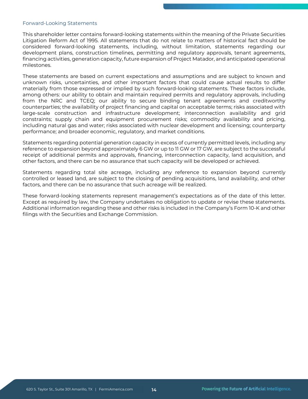 14 620 S. Taylor St., Suite 301 Amarillo, TX | FermiAmerica.com Forward-Looking Statements This shareholder letter contains forward-looking statements within the meaning of the Private Securities Litigation Reform Act of 1995. All statements that do not relate to matters of historical fact should be considered forward-looking statements, including, without limitation, statements regarding our development plans, construction timelines, permitting and regulatory approvals, tenant agreements, financing activities, generation capacity, future expansion of Project Matador, and anticipated operational milestones. These statements are based on current expectations and assumptions and are subject to known and unknown risks, uncertainties, and other important factors that could cause actual results to differ materially from those expressed or implied by such forward-looking statements. These factors include, among others: our ability to obtain and maintain required permits and regulatory approvals, including from the NRC and TCEQ; our ability to secure binding tenant agreements and creditworthy counterparties; the availability of project financing and capital on acceptable terms; risks associated with large-scale construction and infrastructure development; interconnection availability and grid constraints; supply chain and equipment procurement risks; commodity availability and pricing, including natural gas and water; risks associated with nuclear development and licensing; counterparty performance; and broader economic, regulatory, and market conditions. Statements regarding potential generation capacity in excess of currently permitted levels, including any reference to expansion beyond approximately 6 GW or up to 11 GW or 17 GW, are subject to the successful receipt of additional permits and approvals, financing, interconnection capacity, land acquisition, and other factors, and there can be no assurance that such capacity will be developed or achieved. Statements regarding total site acreage, including any reference to expansion beyond currently controlled or leased land, are subject to the closing of pending acquisitions, land availability, and other factors, and there can be no assurance that such acreage will be realized. These forward-looking statements represent management’s expectations as of the date of this letter. Except as required by law, the Company undertakes no obligation to update or revise these statements. Additional information regarding these and other risks is included in the Company’s Form 10-K and other filings with the Securities and Exchange Commission.