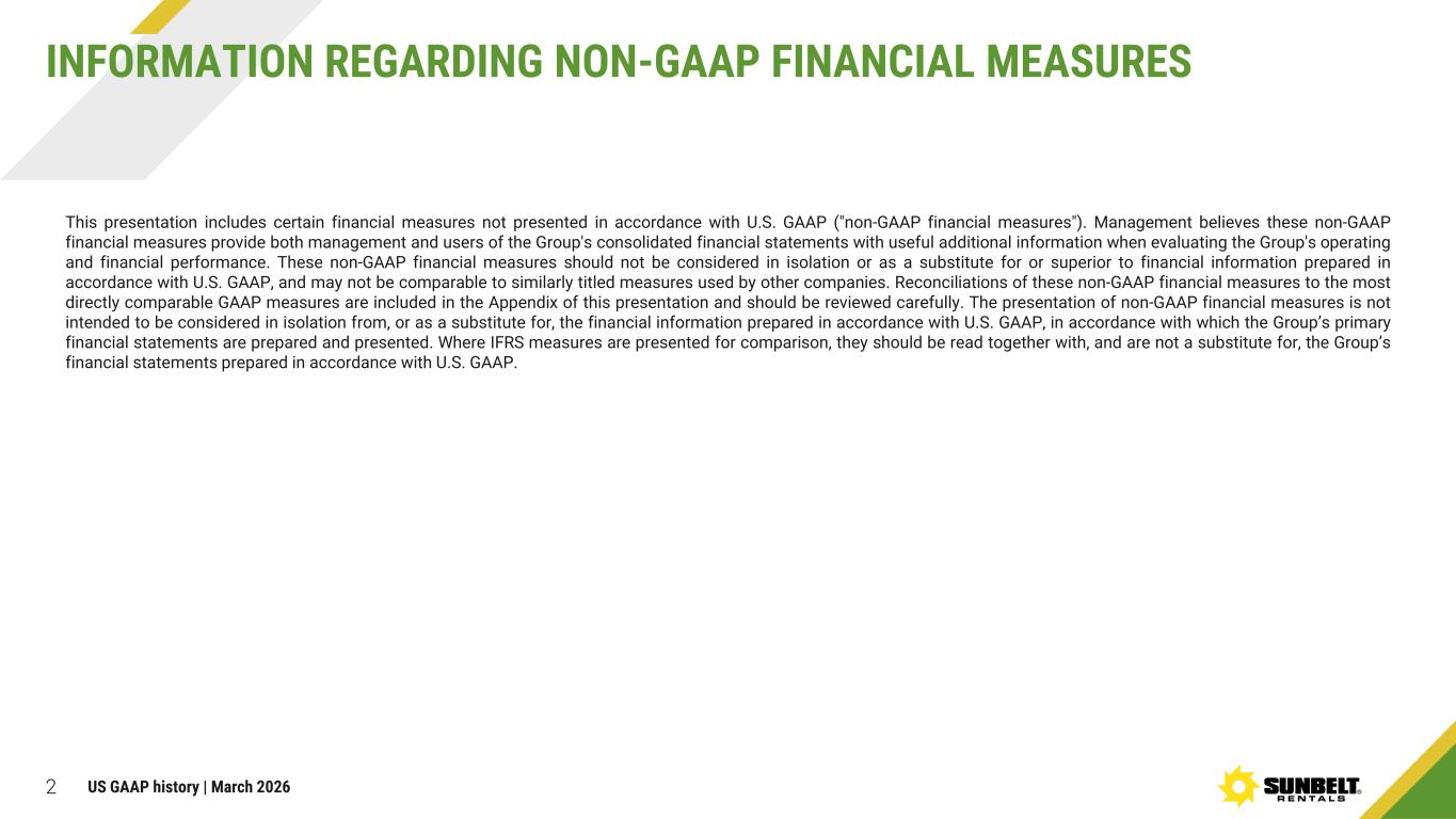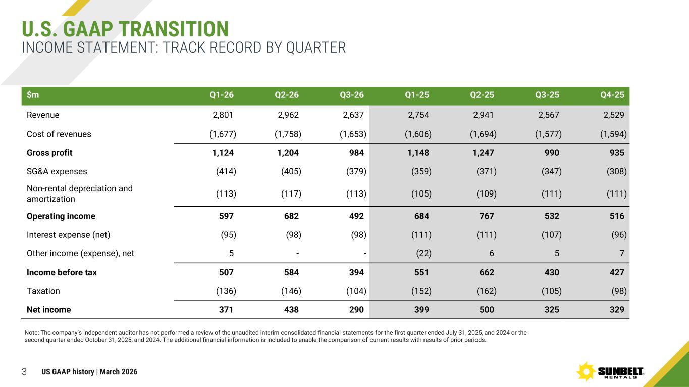 2 INFORMATION REGARDING NON-GAAP FINANCIAL MEASURES This presentation includes certain financial measures not presented in accordance with U.S. GAAP ("non-GAAP financial measures"). Management believes these non-GAAP financial measures provide both management and users of the Group's consolidated financial statements with useful additional information when evaluating the Group's operating and financial performance. These non-GAAP financial measures should not be considered in isolation or as a substitute for or superior to financial information prepared in accordance with U.S. GAAP, and may not be comparable to similarly titled measures used by other companies. Reconciliations of these non-GAAP financial measures to the most directly comparable GAAP measures are included in the Appendix of this presentation and should be reviewed carefully. The presentation of non-GAAP financial measures is not intended to be considered in isolation from, or as a substitute for, the financial information prepared in accordance with U.S. GAAP, in accordance with which the Group’s primary financial statements are prepared and presented. Where IFRS measures are presented for comparison, they should be read together with, and are not a substitute for, the Group’s financial statements prepared in accordance with U.S. GAAP. US GAAP history | March 2026