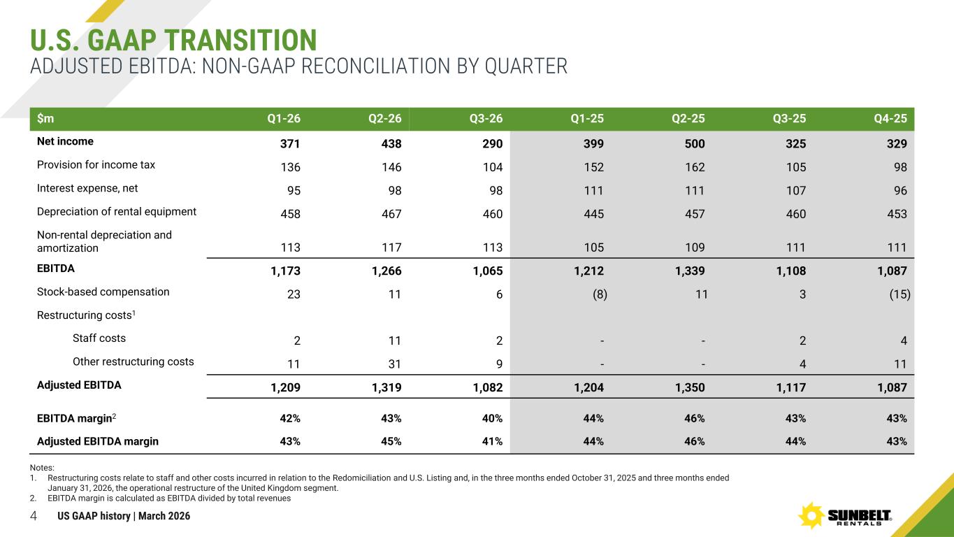 3 INCOME STATEMENT: TRACK RECORD BY QUARTER U.S. GAAP TRANSITION $m Q1-26 Q2-26 Q3-26 Q1-25 Q2-25 Q3-25 Q4-25 Revenue 2,801 2,962 2,637 2,754 2,941 2,567 2,529 Cost of revenues (1,677) (1,758) (1,653) (1,606) (1,694) (1,577) (1,594) Gross profit 1,124 1,204 984 1,148 1,247 990 935 SG&A expenses (414) (405) (379) (359) (371) (347) (308) Non-rental depreciation and amortization (113) (117) (113) (105) (109) (111) (111) Operating income 597 682 492 684 767 532 516 Interest expense (net) (95) (98) (98) (111) (111) (107) (96) Other income (expense), net 5 - - (22) 6 5 7 Income before tax 507 584 394 551 662 430 427 Taxation (136) (146) (104) (152) (162) (105) (98) Net income 371 438 290 399 500 325 329 US GAAP history | March 2026 Note: The company’s independent auditor has not performed a review of the unaudited interim consolidated financial statements for the first quarter ended July 31, 2025, and 2024 or the second quarter ended October 31, 2025, and 2024. The additional financial information is included to enable the comparison of current results with results of prior periods.