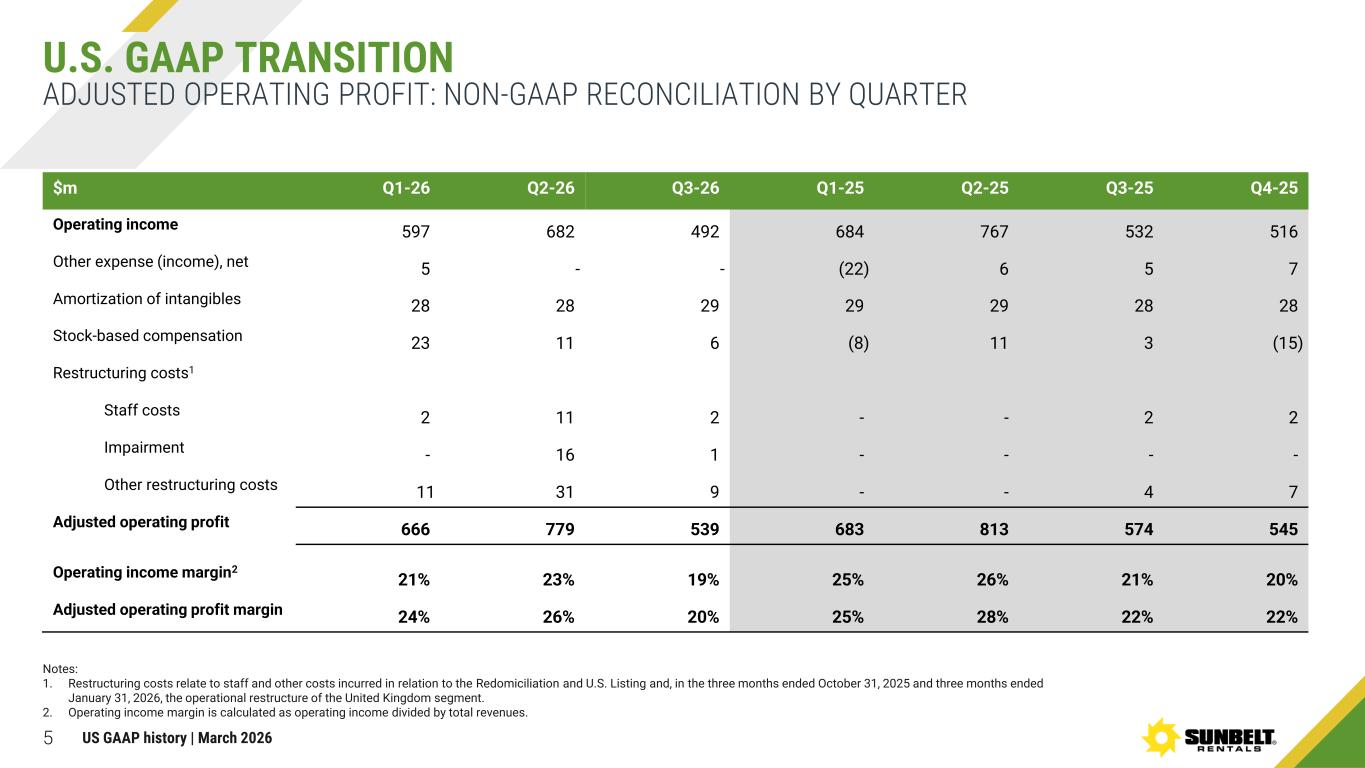4 ADJUSTED EBITDA: NON-GAAP RECONCILIATION BY QUARTER U.S. GAAP TRANSITION $m Q1-26 Q2-26 Q3-26 Q1-25 Q2-25 Q3-25 Q4-25 Net income 371 438 290 399 500 325 329 Provision for income tax 136 146 104 152 162 105 98 Interest expense, net 95 98 98 111 111 107 96 Depreciation of rental equipment 458 467 460 445 457 460 453 Non-rental depreciation and amortization 113 117 113 105 109 111 111 EBITDA 1,173 1,266 1,065 1,212 1,339 1,108 1,087 Stock-based compensation 23 11 6 (8) 11 3 (15) Restructuring costs1 Staff costs 2 11 2 - - 2 4 Other restructuring costs 11 31 9 - - 4 11 Adjusted EBITDA 1,209 1,319 1,082 1,204 1,350 1,117 1,087 EBITDA margin2 42% 43% 40% 44% 46% 43% 43% Adjusted EBITDA margin 43% 45% 41% 44% 46% 44% 43% Notes: 1. Restructuring costs relate to staff and other costs incurred in relation to the Redomiciliation and U.S. Listing and, in the three months ended October 31, 2025 and three months ended January 31, 2026, the operational restructure of the United Kingdom segment. 2. EBITDA margin is calculated as EBITDA divided by total revenues US GAAP history | March 2026