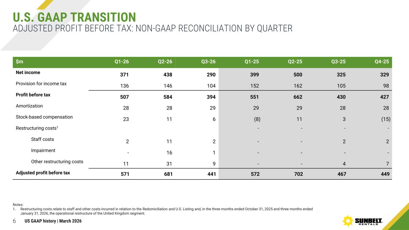 5 ADJUSTED OPERATING PROFIT: NON-GAAP RECONCILIATION BY QUARTER U.S. GAAP TRANSITION $m Q1-26 Q2-26 Q3-26 Q1-25 Q2-25 Q3-25 Q4-25 Operating income 597 682 492 684 767 532 516 Other expense (income), net 5 - - (22) 6 5 7 Amortization of intangibles 28 28 29 29 29 28 28 Stock-based compensation 23 11 6 (8) 11 3 (15) Restructuring costs1 Staff costs 2 11 2 - - 2 2 Impairment - 16 1 - - - - Other restructuring costs 11 31 9 - - 4 7 Adjusted operating profit 666 779 539 683 813 574 545 Operating income margin2 21% 23% 19% 25% 26% 21% 20% Adjusted operating profit margin 24% 26% 20% 25% 28% 22% 22% Notes: 1. Restructuring costs relate to staff and other costs incurred in relation to the Redomiciliation and U.S. Listing and, in the three months ended October 31, 2025 and three months ended January 31, 2026, the operational restructure of the United Kingdom segment. 2. Operating income margin is calculated as operating income divided by total revenues. US GAAP history | March 2026