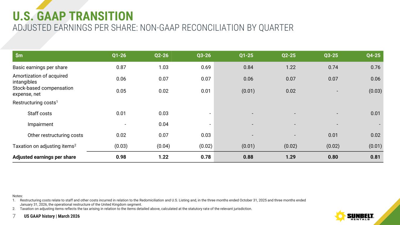 6 ADJUSTED PROFIT BEFORE TAX: NON-GAAP RECONCILIATION BY QUARTER U.S. GAAP TRANSITION $m Q1-26 Q2-26 Q3-26 Q1-25 Q2-25 Q3-25 Q4-25 Net income 371 438 290 399 500 325 329 Provision for income tax 136 146 104 152 162 105 98 Profit before tax 507 584 394 551 662 430 427 Amortization 28 28 29 29 29 28 28 Stock-based compensation 23 11 6 (8) 11 3 (15) Restructuring costs1 - - - - Staff costs 2 11 2 - - 2 2 Impairment - 16 1 - - - - Other restructuring costs 11 31 9 - - 4 7 Adjusted profit before tax 571 681 441 572 702 467 449 Notes: 1. Restructuring costs relate to staff and other costs incurred in relation to the Redomiciliation and U.S. Listing and, in the three months ended October 31, 2025 and three months ended January 31, 2026, the operational restructure of the United Kingdom segment. US GAAP history | March 2026