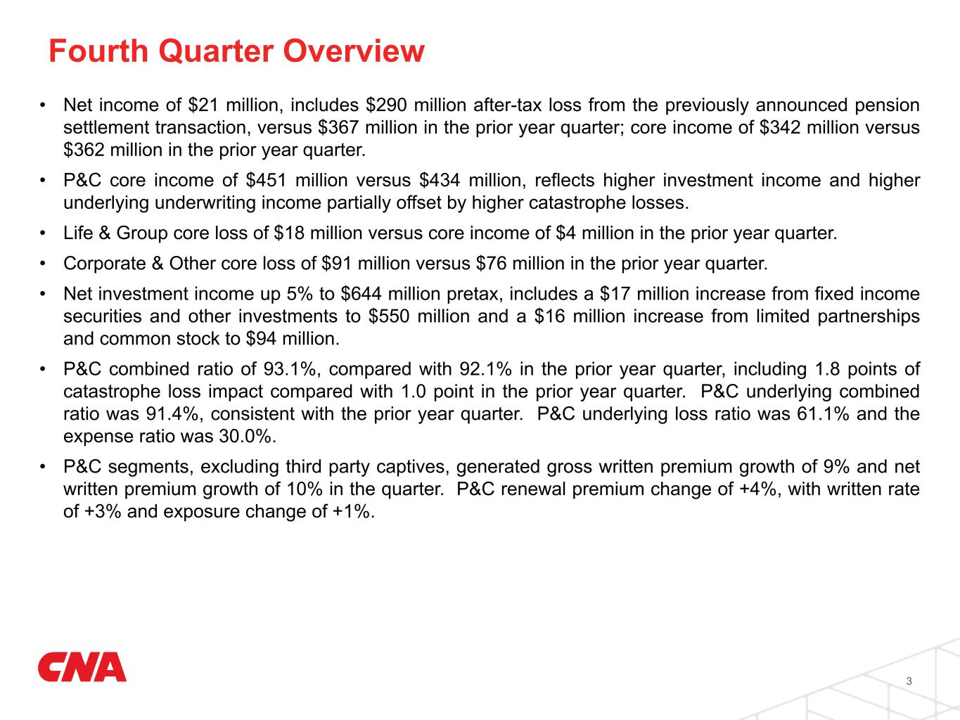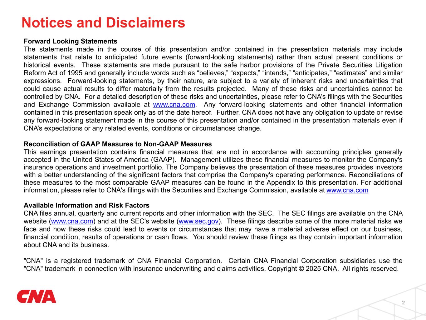 Notices and Disclaimers Forward Looking Statements The statements made in the course of this presentation and/or contained in the presentation materials may include statements that relate to anticipated future events (forward-looking statements) rather than actual present conditions or historical events. These statements are made pursuant to the safe harbor provisions of the Private Securities Litigation Reform Act of 1995 and generally include words such as “believes,” “expects,” “intends,” “anticipates,” “estimates” and similar expressions. Forward-looking statements, by their nature, are subject to a variety of inherent risks and uncertainties that could cause actual results to differ materially from the results projected. Many of these risks and uncertainties cannot be controlled by CNA. For a detailed description of these risks and uncertainties, please refer to CNA’s filings with the Securities and Exchange Commission available at www.cna.com. Any forward-looking statements and other financial information contained in this presentation speak only as of the date hereof. Further, CNA does not have any obligation to update or revise any forward-looking statement made in the course of this presentation and/or contained in the presentation materials even if CNA’s expectations or any related events, conditions or circumstances change. Reconciliation of GAAP Measures to Non-GAAP Measures This earnings presentation contains financial measures that are not in accordance with accounting principles generally accepted in the United States of America (GAAP). Management utilizes these financial measures to monitor the Company's insurance operations and investment portfolio. The Company believes the presentation of these measures provides investors with a better understanding of the significant factors that comprise the Company's operating performance. Reconciliations of these measures to the most comparable GAAP measures can be found in the Appendix to this presentation. For additional information, please refer to CNA's filings with the Securities and Exchange Commission, available at www.cna.com Available Information and Risk Factors CNA files annual, quarterly and current reports and other information with the SEC. The SEC filings are available on the CNA website (www.cna.com) and at the SEC's website (www.sec.gov). These filings describe some of the more material risks we face and how these risks could lead to events or circumstances that may have a material adverse effect on our business, financial condition, results of operations or cash flows. You should review these filings as they contain important information about CNA and its business. "CNA" is a registered trademark of CNA Financial Corporation. Certain CNA Financial Corporation subsidiaries use the "CNA" trademark in connection with insurance underwriting and claims activities. Copyright © 2025 CNA. All rights reserved. 2