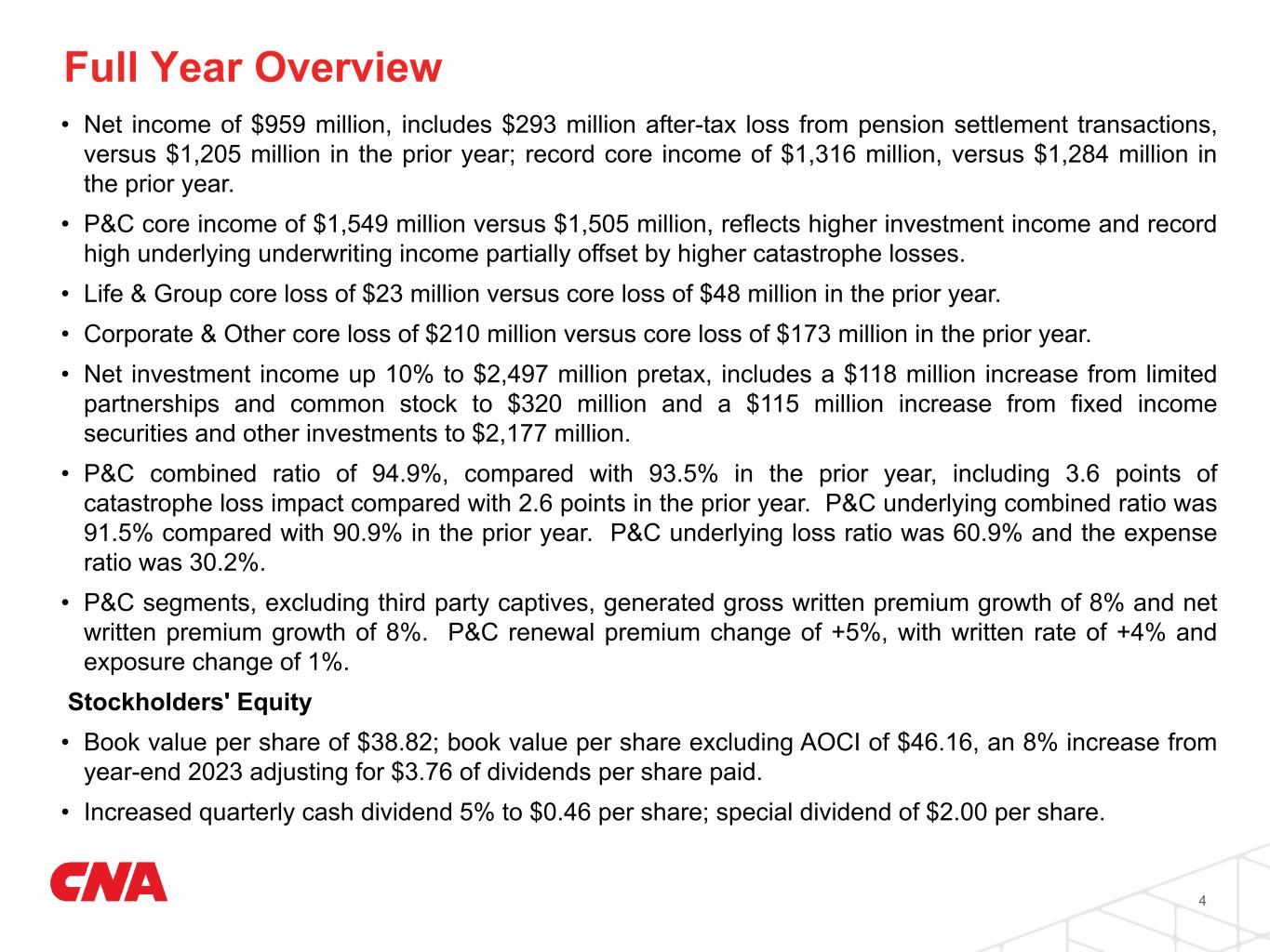 Fourth Quarter Overview • Net income of $21 million, includes $290 million after-tax loss from the previously announced pension settlement transaction, versus $367 million in the prior year quarter; core income of $342 million versus $362 million in the prior year quarter. • P&C core income of $451 million versus $434 million, reflects higher investment income and higher underlying underwriting income partially offset by higher catastrophe losses. • Life & Group core loss of $18 million versus core income of $4 million in the prior year quarter. • Corporate & Other core loss of $91 million versus $76 million in the prior year quarter. • Net investment income up 5% to $644 million pretax, includes a $17 million increase from fixed income securities and other investments to $550 million and a $16 million increase from limited partnerships and common stock to $94 million. • P&C combined ratio of 93.1%, compared with 92.1% in the prior year quarter, including 1.8 points of catastrophe loss impact compared with 1.0 point in the prior year quarter. P&C underlying combined ratio was 91.4%, consistent with the prior year quarter. P&C underlying loss ratio was 61.1% and the expense ratio was 30.0%. • P&C segments, excluding third party captives, generated gross written premium growth of 9% and net written premium growth of 10% in the quarter. P&C renewal premium change of +4%, with written rate of +3% and exposure change of +1%. 3