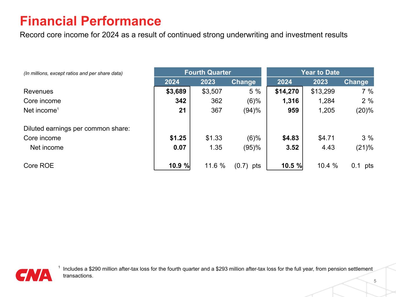 Full Year Overview • Net income of $959 million, includes $293 million after-tax loss from pension settlement transactions, versus $1,205 million in the prior year; record core income of $1,316 million, versus $1,284 million in the prior year. • P&C core income of $1,549 million versus $1,505 million, reflects higher investment income and record high underlying underwriting income partially offset by higher catastrophe losses. • Life & Group core loss of $23 million versus core loss of $48 million in the prior year. • Corporate & Other core loss of $210 million versus core loss of $173 million in the prior year. • Net investment income up 10% to $2,497 million pretax, includes a $118 million increase from limited partnerships and common stock to $320 million and a $115 million increase from fixed income securities and other investments to $2,177 million. • P&C combined ratio of 94.9%, compared with 93.5% in the prior year, including 3.6 points of catastrophe loss impact compared with 2.6 points in the prior year. P&C underlying combined ratio was 91.5% compared with 90.9% in the prior year. P&C underlying loss ratio was 60.9% and the expense ratio was 30.2%. • P&C segments, excluding third party captives, generated gross written premium growth of 8% and net written premium growth of 8%. P&C renewal premium change of +5%, with written rate of +4% and exposure change of 1%. Stockholders' Equity • Book value per share of $38.82; book value per share excluding AOCI of $46.16, an 8% increase from year-end 2023 adjusting for $3.76 of dividends per share paid. • Increased quarterly cash dividend 5% to $0.46 per share; special dividend of $2.00 per share. 4