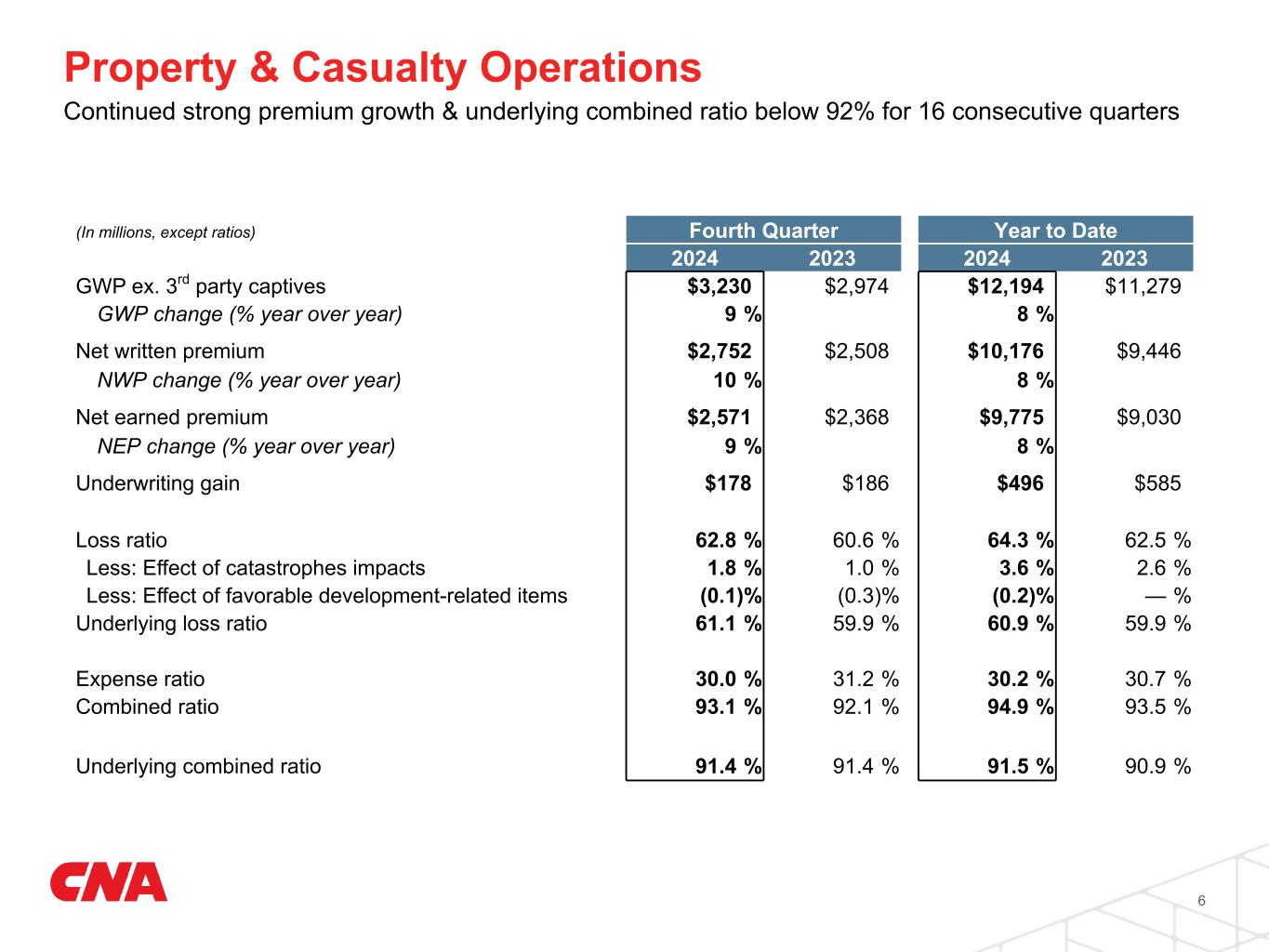 Financial Performance 5 (In millions, except ratios and per share data) Fourth Quarter Year to Date 2024 2023 Change 2024 2023 Change Revenues $3,689 $3,507 5 % $14,270 $13,299 7 % Core income 342 362 (6) % 1,316 1,284 2 % Net income1 21 367 (94) % 959 1,205 (20) % Diluted earnings per common share: Core income $1.25 $1.33 (6) % $4.83 $4.71 3 % Net income 0.07 1.35 (95) % 3.52 4.43 (21) % Core ROE 10.9 % 11.6 % (0.7) pts 10.5 % 10.4 % 0.1 pts Record core income for 2024 as a result of continued strong underwriting and investment results 1 Includes a $290 million after-tax loss for the fourth quarter and a $293 million after-tax loss for the full year, from pension settlement transactions.