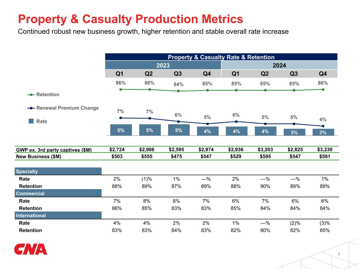 Continued strong premium growth & underlying combined ratio below 92% for 16 consecutive quarters Property & Casualty Operations 6 (In millions, except ratios) Fourth Quarter Year to Date 2024 2023 2024 2023 GWP ex. 3rd party captives $3,230 $2,974 $12,194 $11,279 GWP change (% year over year) 9 % 8 % Net written premium $2,752 $2,508 $10,176 $9,446 NWP change (% year over year) 10 % 8 % Net earned premium $2,571 $2,368 $9,775 $9,030 NEP change (% year over year) 9 % 8 % Underwriting gain $178 $186 $496 $585 Loss ratio 62.8 % 60.6 % 64.3 % 62.5 % Less: Effect of catastrophes impacts 1.8 % 1.0 % 3.6 % 2.6 % Less: Effect of favorable development-related items (0.1) % (0.3) % (0.2) % — % Underlying loss ratio 61.1 % 59.9 % 60.9 % 59.9 % Expense ratio 30.0 % 31.2 % 30.2 % 30.7 % Combined ratio 93.1 % 92.1 % 94.9 % 93.5 % Underlying combined ratio 91.4 % 91.4 % 91.5 % 90.9 %