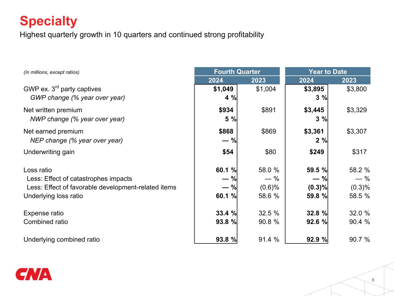 Property & Casualty Production Metrics Continued robust new business growth, higher retention and stable overall rate increase 7 Property & Casualty Rate & Retention 2023 2024 Q1 Q2 Q3 Q4 Q1 Q2 Q3 Q4 5% 5% 5% 4% 4% 4% 3% 3% 7% 7% 6% 5% 6% 5% 5% 4% 86% 86% 84% 85% 85% 85% 85% 86% Retention Renewal Premium Change Rate GWP ex. 3rd party captives ($M) $2,724 $2,986 $2,595 $2,974 $2,936 $3,203 $2,825 $3,230 New Business ($M) $503 $555 $475 $547 $529 $595 $547 $591 Specialty Rate 2% (1)% 1% —% 2% —% —% 1% Retention 88% 89% 87% 89% 88% 90% 89% 89% Commercial Rate 7% 8% 8% 7% 6% 7% 6% 6% Retention 86% 85% 83% 83% 85% 84% 84% 84% International Rate 4% 4% 2% 2% 1% —% (2)% (3)% Retention 83% 83% 84% 83% 82% 80% 82% 85%
