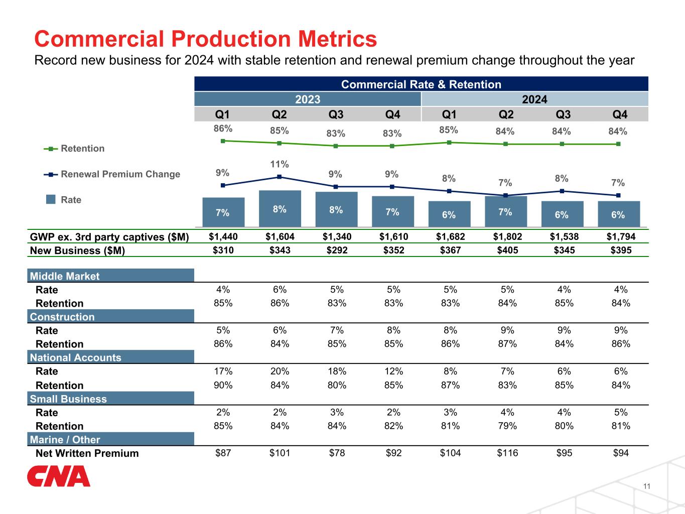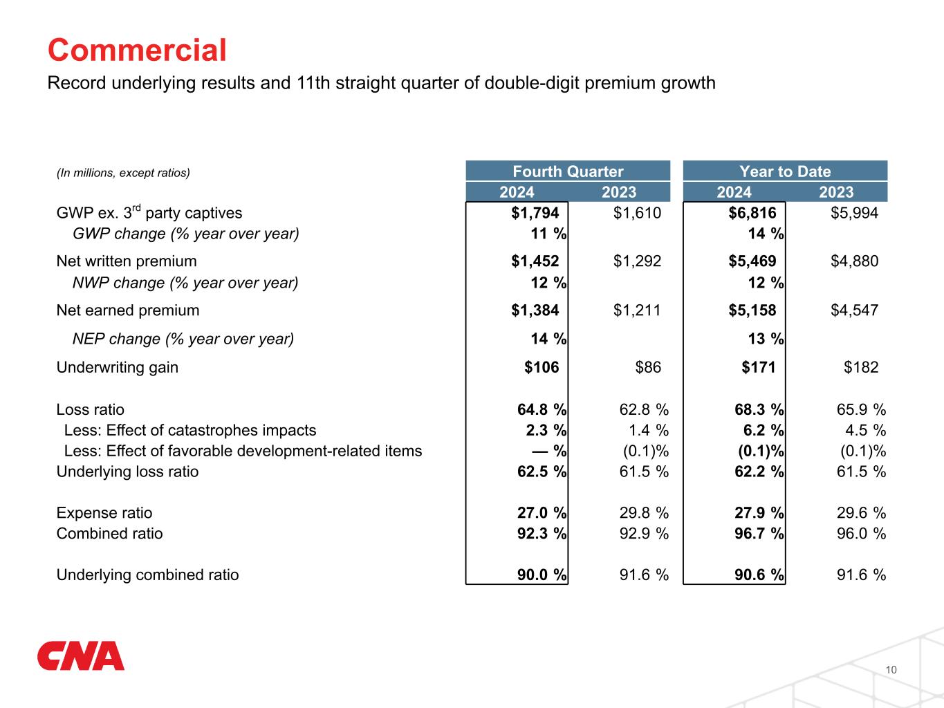 Commercial 10 (In millions, except ratios) Fourth Quarter Year to Date 2024 2023 2024 2023 GWP ex. 3rd party captives $1,794 $1,610 $6,816 $5,994 GWP change (% year over year) 11 % 14 % Net written premium $1,452 $1,292 $5,469 $4,880 NWP change (% year over year) 12 % 12 % Net earned premium $1,384 $1,211 $5,158 $4,547 NEP change (% year over year) 14 % 13 % Underwriting gain $106 $86 $171 $182 Loss ratio 64.8 % 62.8 % 68.3 % 65.9 % Less: Effect of catastrophes impacts 2.3 % 1.4 % 6.2 % 4.5 % Less: Effect of favorable development-related items — % (0.1) % (0.1) % (0.1) % Underlying loss ratio 62.5 % 61.5 % 62.2 % 61.5 % Expense ratio 27.0 % 29.8 % 27.9 % 29.6 % Combined ratio 92.3 % 92.9 % 96.7 % 96.0 % Underlying combined ratio 90.0 % 91.6 % 90.6 % 91.6 % Record underlying results and 11th straight quarter of double-digit premium growth