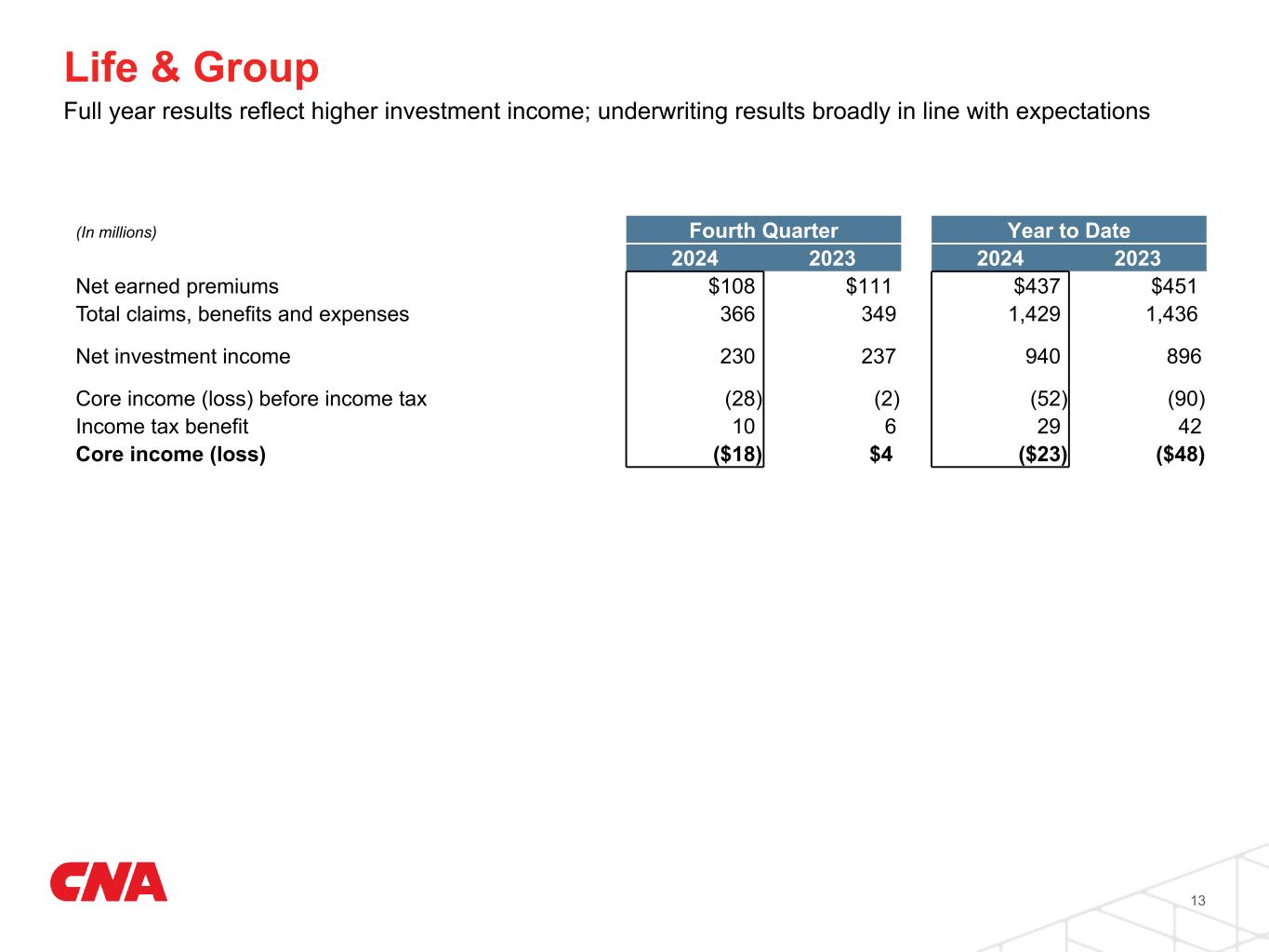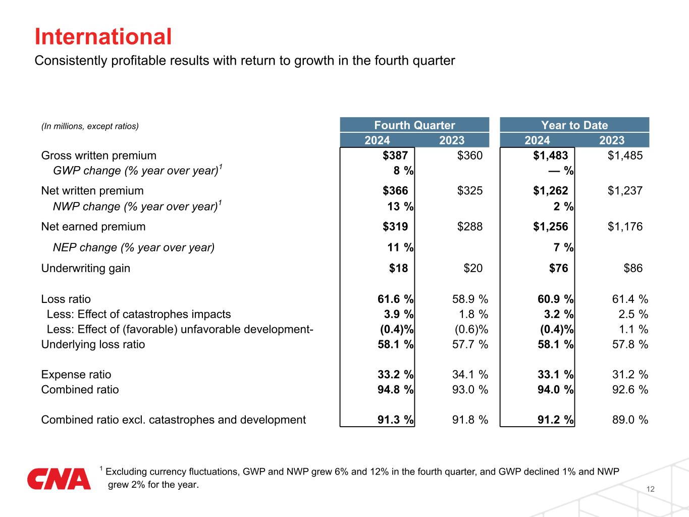 1 Excluding currency fluctuations, GWP and NWP grew 6% and 12% in the fourth quarter, and GWP declined 1% and NWP grew 2% for the year. International Consistently profitable results with return to growth in the fourth quarter 12 (In millions, except ratios) Fourth Quarter Year to Date 2024 2023 2024 2023 Gross written premium $387 $360 $1,483 $1,485 GWP change (% year over year)1 8 % — % Net written premium $366 $325 $1,262 $1,237 NWP change (% year over year)1 13 % 2 % Net earned premium $319 $288 $1,256 $1,176 NEP change (% year over year) 11 % 7 % Underwriting gain $18 $20 $76 $86 Loss ratio 61.6 % 58.9 % 60.9 % 61.4 % Less: Effect of catastrophes impacts 3.9 % 1.8 % 3.2 % 2.5 % Less: Effect of (favorable) unfavorable development- (0.4) % (0.6) % (0.4) % 1.1 % Underlying loss ratio 58.1 % 57.7 % 58.1 % 57.8 % Expense ratio 33.2 % 34.1 % 33.1 % 31.2 % Combined ratio 94.8 % 93.0 % 94.0 % 92.6 % Combined ratio excl. catastrophes and development 91.3 % 91.8 % 91.2 % 89.0 %