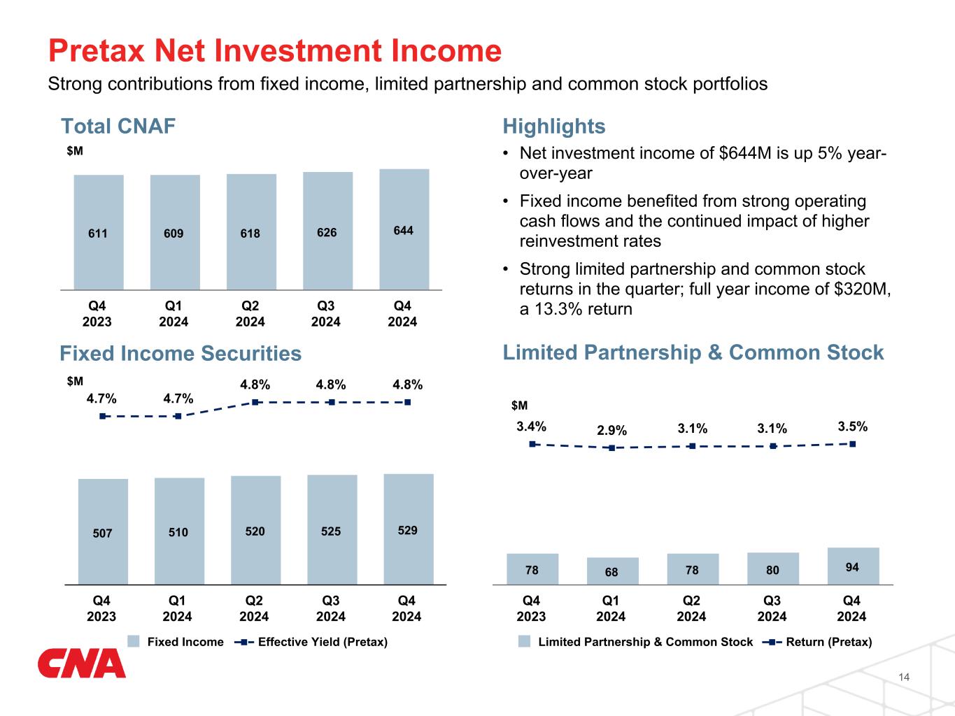 Full year results reflect higher investment income; underwriting results broadly in line with expectations Life & Group 13 (In millions) Fourth Quarter Year to Date 2024 2023 2024 2023 Net earned premiums $108 $111 $437 $451 Total claims, benefits and expenses 366 349 1,429 1,436 Net investment income 230 237 940 896 Core income (loss) before income tax (28) (2) (52) (90) Income tax benefit 10 6 29 42 Core income (loss) ($18) $4 ($23) ($48)