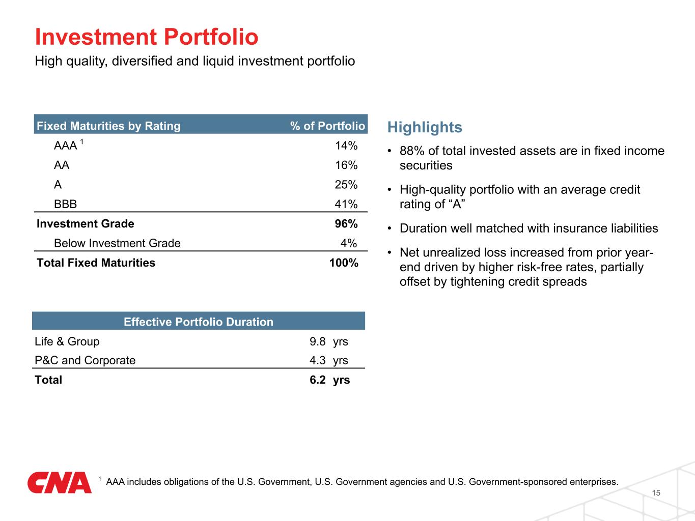 Pretax Net Investment Income Strong contributions from fixed income, limited partnership and common stock portfolios 611 609 618 626 644 Q4 2023 Q1 2024 Q2 2024 Q3 2024 Q4 2024 Total CNAF Limited Partnership & Common Stock Highlights Fixed Income Securities 507 510 520 525 529 4.7% 4.7% 4.8% 4.8% 4.8% Fixed Income Effective Yield (Pretax) Q4 2023 Q1 2024 Q2 2024 Q3 2024 Q4 2024 78 68 78 80 94 3.4% 2.9% 3.1% 3.1% 3.5% Limited Partnership & Common Stock Return (Pretax) Q4 2023 Q1 2024 Q2 2024 Q3 2024 Q4 2024 $M $M $M 14 • Net investment income of $644M is up 5% year- over-year • Fixed income benefited from strong operating cash flows and the continued impact of higher reinvestment rates • Strong limited partnership and common stock returns in the quarter; full year income of $320M, a 13.3% return