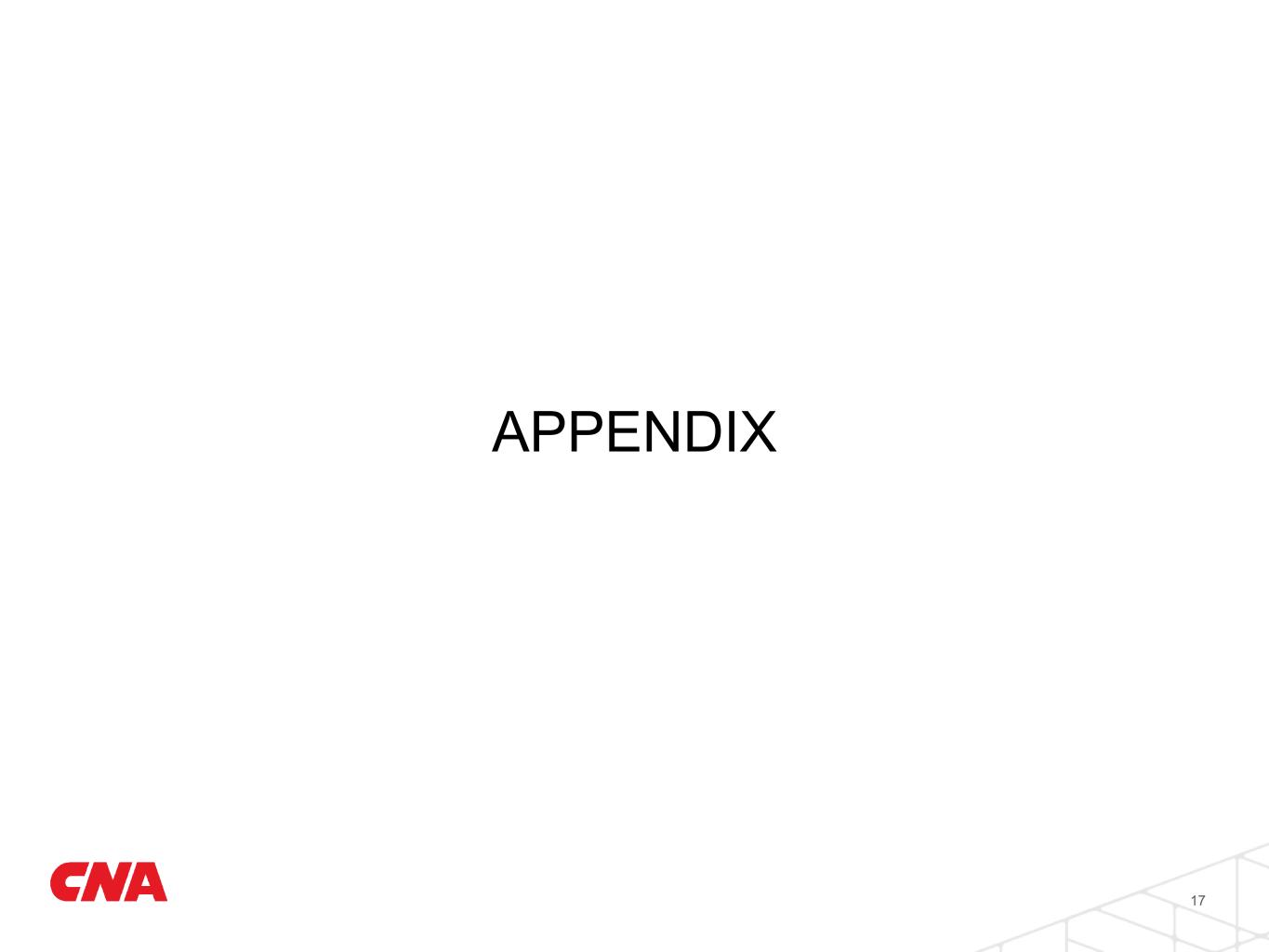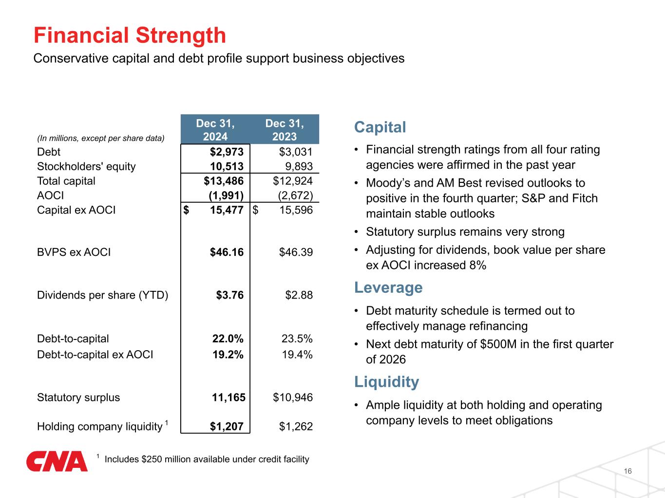 Capital • Financial strength ratings from all four rating agencies were affirmed in the past year • Moody’s and AM Best revised outlooks to positive in the fourth quarter; S&P and Fitch maintain stable outlooks • Statutory surplus remains very strong • Adjusting for dividends, book value per share ex AOCI increased 8% Leverage • Debt maturity schedule is termed out to effectively manage refinancing • Next debt maturity of $500M in the first quarter of 2026 Liquidity • Ample liquidity at both holding and operating company levels to meet obligations Financial Strength Conservative capital and debt profile support business objectives (In millions, except per share data) Dec 31, 2024 Dec 31, 2023 Debt $2,973 $3,031 Stockholders' equity 10,513 9,893 Total capital $13,486 $12,924 AOCI (1,991) (2,672) Capital ex AOCI $ 15,477 $ 15,596 BVPS ex AOCI $46.16 $46.39 Dividends per share (YTD) $3.76 $2.88 Debt-to-capital 22.0 % 23.5 % Debt-to-capital ex AOCI 19.2 % 19.4 % Statutory surplus 11,165 $10,946 Holding company liquidity 1 $1,207 $1,262 16 1 Includes $250 million available under credit facility