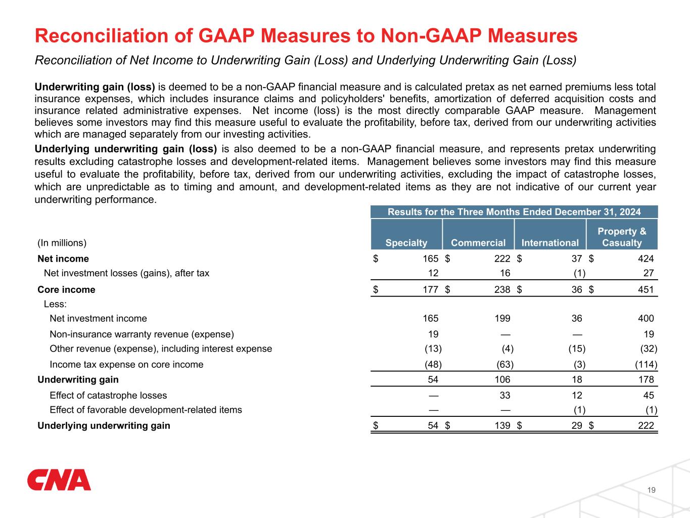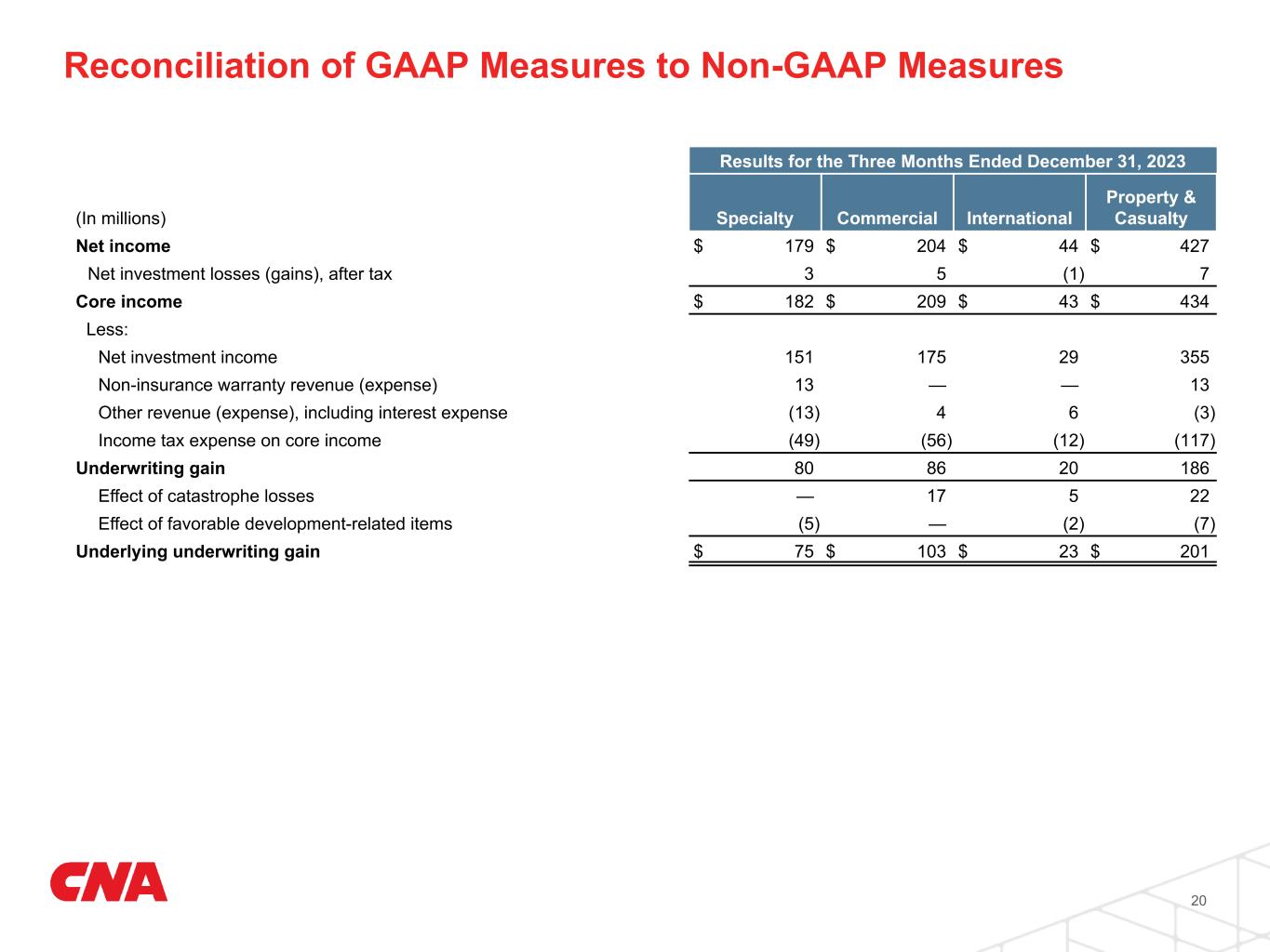 19 Underwriting gain (loss) is deemed to be a non-GAAP financial measure and is calculated pretax as net earned premiums less total insurance expenses, which includes insurance claims and policyholders' benefits, amortization of deferred acquisition costs and insurance related administrative expenses. Net income (loss) is the most directly comparable GAAP measure. Management believes some investors may find this measure useful to evaluate the profitability, before tax, derived from our underwriting activities which are managed separately from our investing activities. Underlying underwriting gain (loss) is also deemed to be a non-GAAP financial measure, and represents pretax underwriting results excluding catastrophe losses and development-related items. Management believes some investors may find this measure useful to evaluate the profitability, before tax, derived from our underwriting activities, excluding the impact of catastrophe losses, which are unpredictable as to timing and amount, and development-related items as they are not indicative of our current year underwriting performance. Results for the Three Months Ended December 31, 2024 (In millions) Specialty Commercial International Property & Casualty Net income $ 165 $ 222 $ 37 $ 424 Net investment losses (gains), after tax 12 16 (1) 27 Core income $ 177 $ 238 $ 36 $ 451 Less: Net investment income 165 199 36 400 Non-insurance warranty revenue (expense) 19 — — 19 Other revenue (expense), including interest expense (13) (4) (15) (32) Income tax expense on core income (48) (63) (3) (114) Underwriting gain 54 106 18 178 Effect of catastrophe losses — 33 12 45 Effect of favorable development-related items — — (1) (1) Underlying underwriting gain $ 54 $ 139 $ 29 $ 222 Reconciliation of Net Income to Underwriting Gain (Loss) and Underlying Underwriting Gain (Loss) Reconciliation of GAAP Measures to Non-GAAP Measures