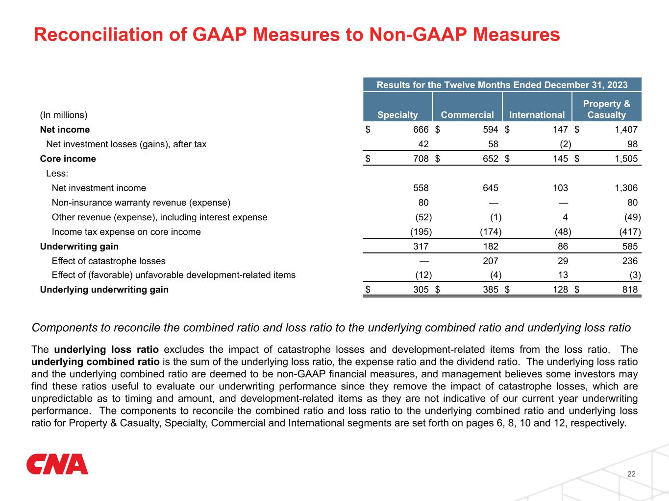21 Results for the Twelve Months Ended December 31, 2024 (In millions) Specialty Commercial International Property & Casualty Net income $ 663 $ 658 $ 153 $ 1,474 Net investment losses, after tax 31 44 — 75 Core income $ 694 $ 702 $ 153 $ 1,549 Less: Net investment income 626 733 131 1,490 Non-insurance warranty revenue (expense) 62 — — 62 Other revenue (expense), including interest expense (53) (14) (10) (77) Income tax expense on core income (190) (188) (44) (422) Underwriting gain 249 171 76 496 Effect of catastrophe losses — 318 40 358 Effect of favorable development-related items (8) — (6) (14) Underlying underwriting gain $ 241 $ 489 $ 110 $ 840 Reconciliation of GAAP Measures to Non-GAAP Measures