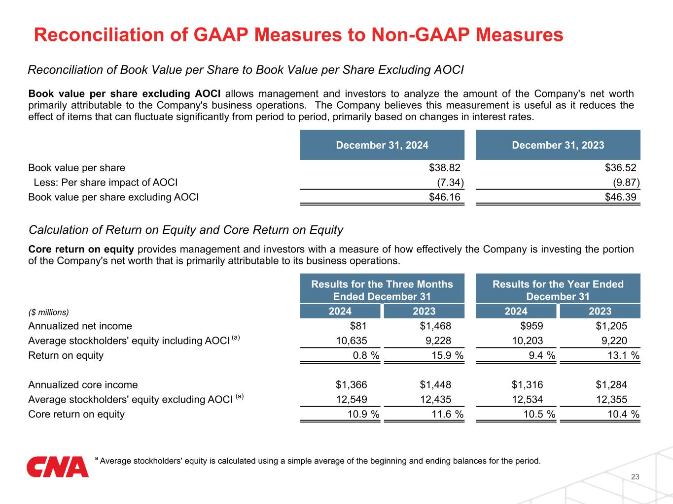December 31, 2024 December 31, 2023 Book value per share $38.82 $36.52 Less: Per share impact of AOCI (7.34) (9.87) Book value per share excluding AOCI $46.16 $46.39 Book value per share excluding AOCI allows management and investors to analyze the amount of the Company's net worth primarily attributable to the Company's business operations. The Company believes this measurement is useful as it reduces the effect of items that can fluctuate significantly from period to period, primarily based on changes in interest rates. Calculation of Return on Equity and Core Return on Equity Results for the Three Months Ended December 31 Results for the Year Ended December 31 ($ millions) 2024 2023 2024 2023 Annualized net income $81 $1,468 $959 $1,205 Average stockholders' equity including AOCI (a) 10,635 9,228 10,203 9,220 Return on equity 0.8 % 15.9 % 9.4 % 13.1 % Annualized core income $1,366 $1,448 $1,316 $1,284 Average stockholders' equity excluding AOCI (a) 12,549 12,435 12,534 12,355 Core return on equity 10.9 % 11.6 % 10.5 % 10.4 % Core return on equity provides management and investors with a measure of how effectively the Company is investing the portion of the Company's net worth that is primarily attributable to its business operations. a Average stockholders' equity is calculated using a simple average of the beginning and ending balances for the period. 23 Reconciliation of Book Value per Share to Book Value per Share Excluding AOCI Reconciliation of GAAP Measures to Non-GAAP Measures