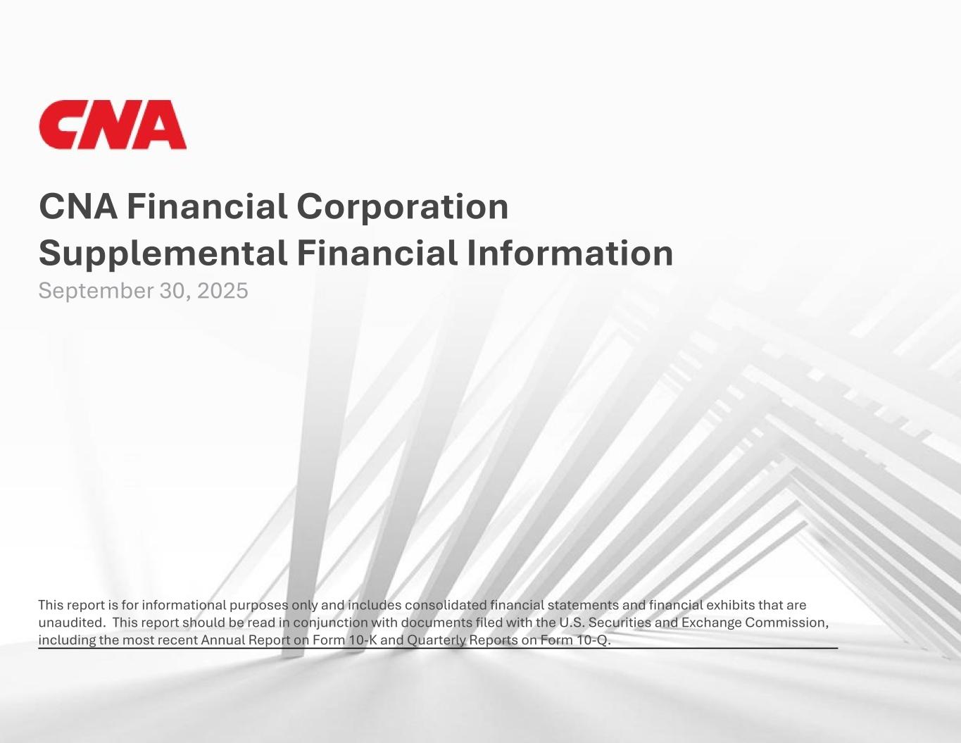 CNA Financial Corporation Supplemental Financial Information September 30, 2025 This report is for informational purposes only and includes consolidated financial statements and financial exhibits that are unaudited. This report should be read in conjunction with documents filed with the U.S. Securities and Exchange Commission, including the most recent Annual Report on Form 10-K and Quarterly Reports on Form 10-Q.