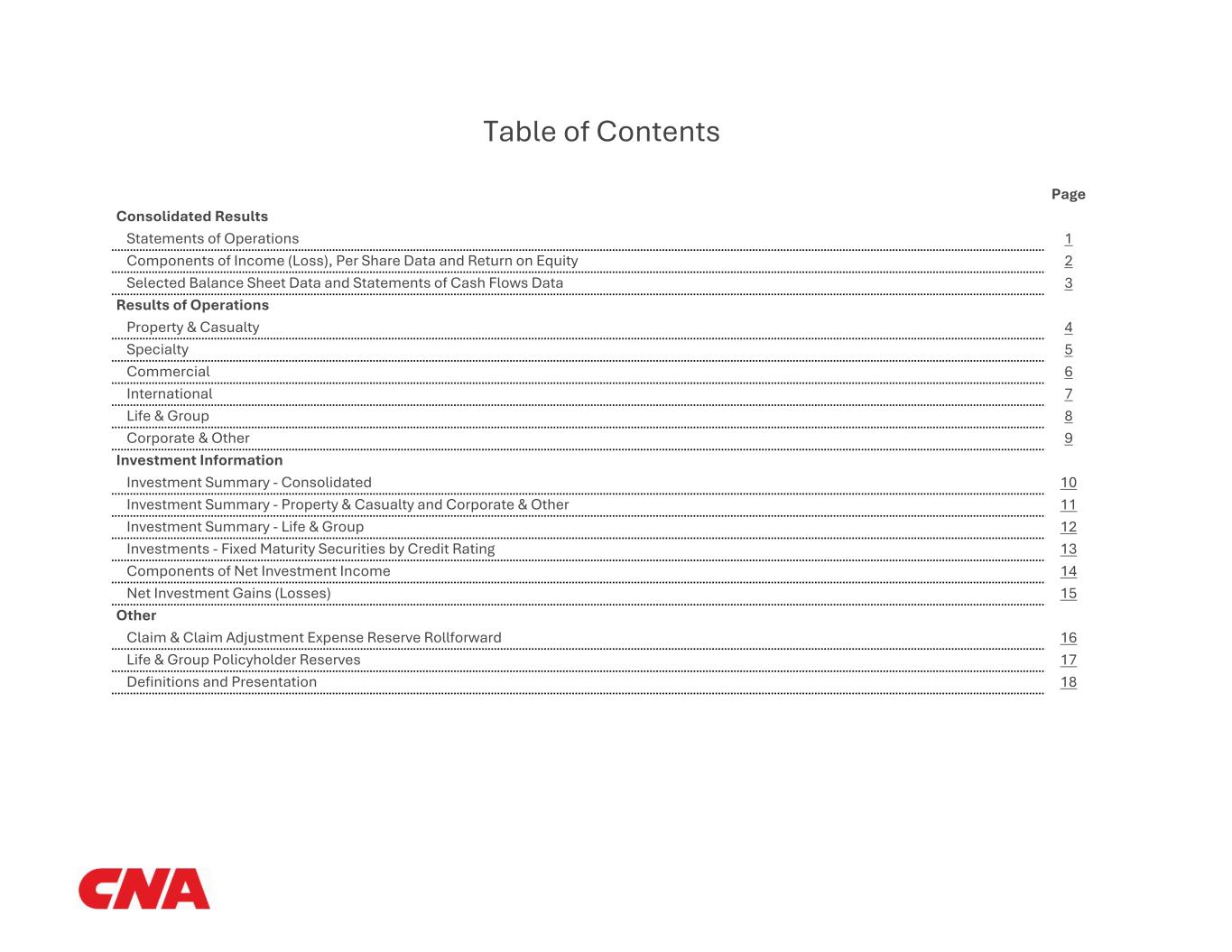 Table of Contents Consolidated Results Statements of Operations 1 Components of Income (Loss), Per Share Data and Return on Equity 2 Selected Balance Sheet Data and Statements of Cash Flows Data 3 Results of Operations Property & Casualty 4 Specialty 5 Commercial 6 International 7 Life & Group 8 Corporate & Other 9 Investment Information Investment Summary - Consolidated 10 Investment Summary - Property & Casualty and Corporate & Other 11 Investment Summary - Life & Group 12 Investments - Fixed Maturity Securities by Credit Rating 13 Components of Net Investment Income 14 Net Investment Gains (Losses) 15 Other Claim & Claim Adjustment Expense Reserve Rollforward 16 Life & Group Policyholder Reserves 17 Definitions and Presentation 18 Page