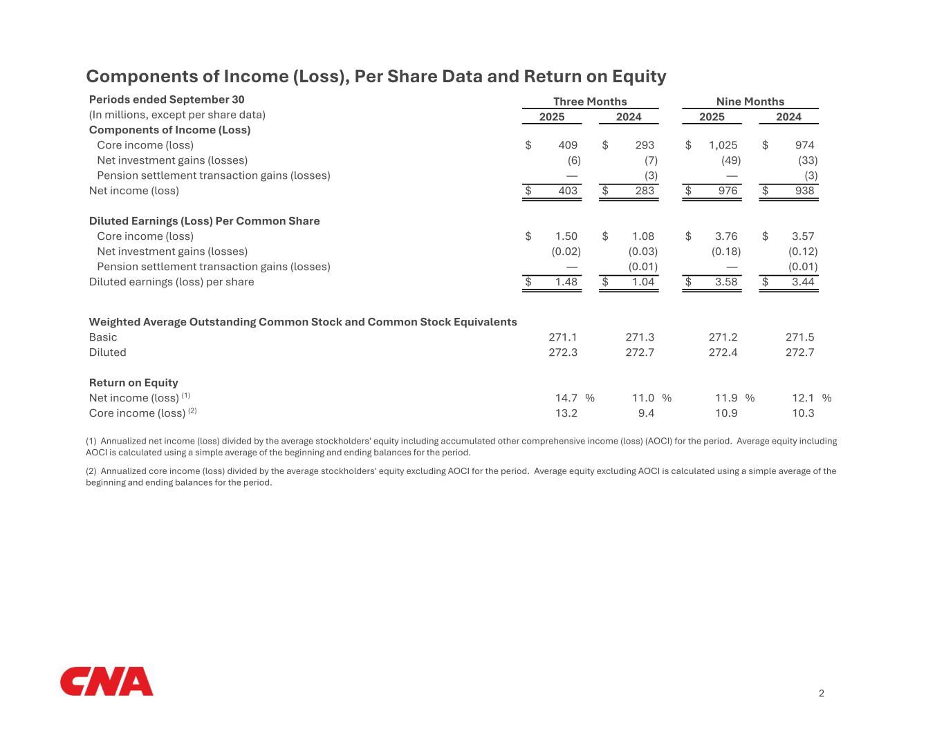 Components of Income (Loss), Per Share Data and Return on Equity Periods ended September 30 Three Months Nine Months (In millions, except per share data) 2025 2024 2025 2024 Components of Income (Loss) Core income (loss) $ 409 $ 293 $ 1,025 $ 974 Net investment gains (losses) (6) (7) (49) (33) Pension settlement transaction gains (losses) — (3) — (3) Net income (loss) $ 403 $ 283 $ 976 $ 938 Diluted Earnings (Loss) Per Common Share Core income (loss) $ 1.50 $ 1.08 $ 3.76 $ 3.57 Net investment gains (losses) (0.02) (0.03) (0.18) (0.12) Pension settlement transaction gains (losses) — (0.01) — (0.01) Diluted earnings (loss) per share $ 1.48 $ 1.04 $ 3.58 $ 3.44 Weighted Average Outstanding Common Stock and Common Stock Equivalents Basic 271.1 271.3 271.2 271.5 Diluted 272.3 272.7 272.4 272.7 Return on Equity Net income (loss) (1) 14.7 % 11.0 % 11.9 % 12.1 % Core income (loss) (2) 13.2 9.4 10.9 10.3 (1) Annualized net income (loss) divided by the average stockholders' equity including accumulated other comprehensive income (loss) (AOCI) for the period. Average equity including AOCI is calculated using a simple average of the beginning and ending balances for the period. (2) Annualized core income (loss) divided by the average stockholders' equity excluding AOCI for the period. Average equity excluding AOCI is calculated using a simple average of the beginning and ending balances for the period. 2