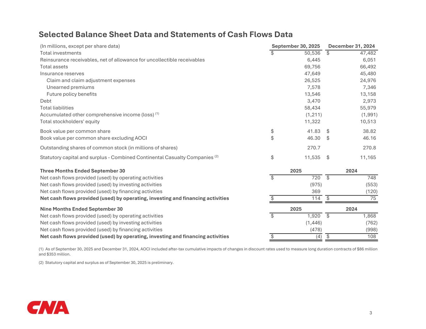 Selected Balance Sheet Data and Statements of Cash Flows Data (In millions, except per share data) September 30, 2025 December 31, 2024 Total investments $ 50,536 $ 47,482 Reinsurance receivables, net of allowance for uncollectible receivables 6,445 6,051 Total assets 69,756 66,492 Insurance reserves 47,649 45,480 Claim and claim adjustment expenses 26,525 24,976 Unearned premiums 7,578 7,346 Future policy benefits 13,546 13,158 Debt 3,470 2,973 Total liabilities 58,434 55,979 Accumulated other comprehensive income (loss) (1) (1,211) (1,991) Total stockholders' equity 11,322 10,513 Book value per common share $ 41.83 $ 38.82 Book value per common share excluding AOCI $ 46.30 $ 46.16 Outstanding shares of common stock (in millions of shares) 270.7 270.8 Statutory capital and surplus - Combined Continental Casualty Companies (2) $ 11,535 $ 11,165 Three Months Ended September 30 2025 2024 Net cash flows provided (used) by operating activities $ 720 $ 748 Net cash flows provided (used) by investing activities (975) (553) Net cash flows provided (used) by financing activities 369 (120) Net cash flows provided (used) by operating, investing and financing activities $ 114 $ 75 Nine Months Ended September 30 2025 2024 Net cash flows provided (used) by operating activities $ 1,920 $ 1,868 Net cash flows provided (used) by investing activities (1,446) (762) Net cash flows provided (used) by financing activities (478) (998) Net cash flows provided (used) by operating, investing and financing activities $ (4) $ 108 (1) As of September 30, 2025 and December 31, 2024, AOCI included after-tax cumulative impacts of changes in discount rates used to measure long duration contracts of $86 million and $353 million. (2) Statutory capital and surplus as of September 30, 2025 is preliminary. 3