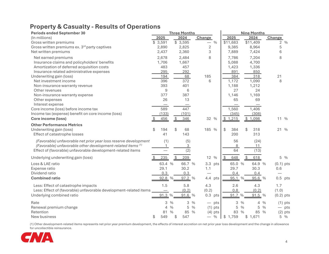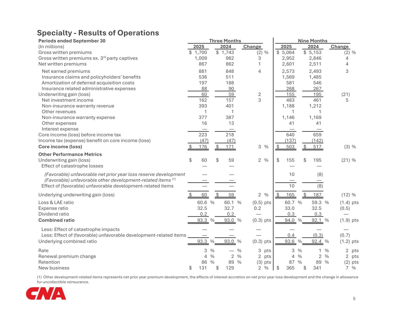 Property & Casualty - Results of Operations Periods ended September 30 Three Months Nine Months (In millions) 2025 2024 Change 2025 2024 Change Gross written premiums $ 3,591 $ 3,595 — % $ 11,683 $ 11,409 2 % Gross written premiums ex. 3rd party captives 2,890 2,825 2 9,385 8,964 5 Net written premiums 2,437 2,360 3 7,889 7,424 6 Net earned premiums 2,678 2,484 8 7,786 7,204 8 Insurance claims and policyholders' benefits 1,706 1,667 5,088 4,700 Amortization of deferred acquisition costs 483 457 1,423 1,336 Insurance related administrative expenses 295 292 891 850 Underwriting gain (loss) 194 68 185 384 318 21 Net investment income 396 372 6 1,172 1,090 8 Non-insurance warranty revenue 393 401 1,188 1,212 Other revenues 9 6 27 24 Non-insurance warranty expense 377 387 1,146 1,169 Other expenses 26 13 65 69 Interest expense — — — — Core income (loss) before income tax 589 447 1,560 1,406 Income tax (expense) benefit on core income (loss) (133) (101) (345) (308) Core income (loss) $ 456 $ 346 32 % $ 1,215 $ 1,098 11 % Other Performance Metrics Underwriting gain (loss) $ 194 $ 68 185 % $ 384 $ 318 21 % Effect of catastrophe losses 41 143 200 313 (Favorable) unfavorable net prior year loss reserve development (1) (5) 56 (24) (Favorable) unfavorable other development-related items (1) 1 3 8 11 Effect of (favorable) unfavorable development-related items — (2) 64 (13) Underlying underwriting gain (loss) $ 235 $ 209 12 % $ 648 $ 618 5 % Loss & LAE ratio 63.4 % 66.7 % 3.3 pts 65.0 % 64.9 % (0.1) pts Expense ratio 29.1 30.2 1.1 29.7 30.3 0.6 Dividend ratio 0.3 0.3 — 0.4 0.4 — Combined ratio 92.8 % 97.2 % 4.4 pts 95.1 % 95.6 % 0.5 pts Less: Effect of catastrophe impacts 1.5 5.8 4.3 2.6 4.3 1.7 Less: Effect of (favorable) unfavorable development-related items — (0.2) (0.2) 0.8 (0.2) (1.0) Underlying combined ratio 91.3 % 91.6 % 0.3 pts 91.7 % 91.5 % (0.2) pts Rate 3 % 3 % — pts 3 % 4 % (1) pts Renewal premium change 4 % 5 % (1) pts 5 % 5 % — pts Retention 81 % 85 % (4) pts 83 % 85 % (2) pts New business $ 549 $ 547 — % $ 1,759 $ 1,671 5 % (1) Other development-related items represents net prior year premium development, the effects of interest accretion on net prior year loss development and the change in allowance for uncollectible reinsurance. 4