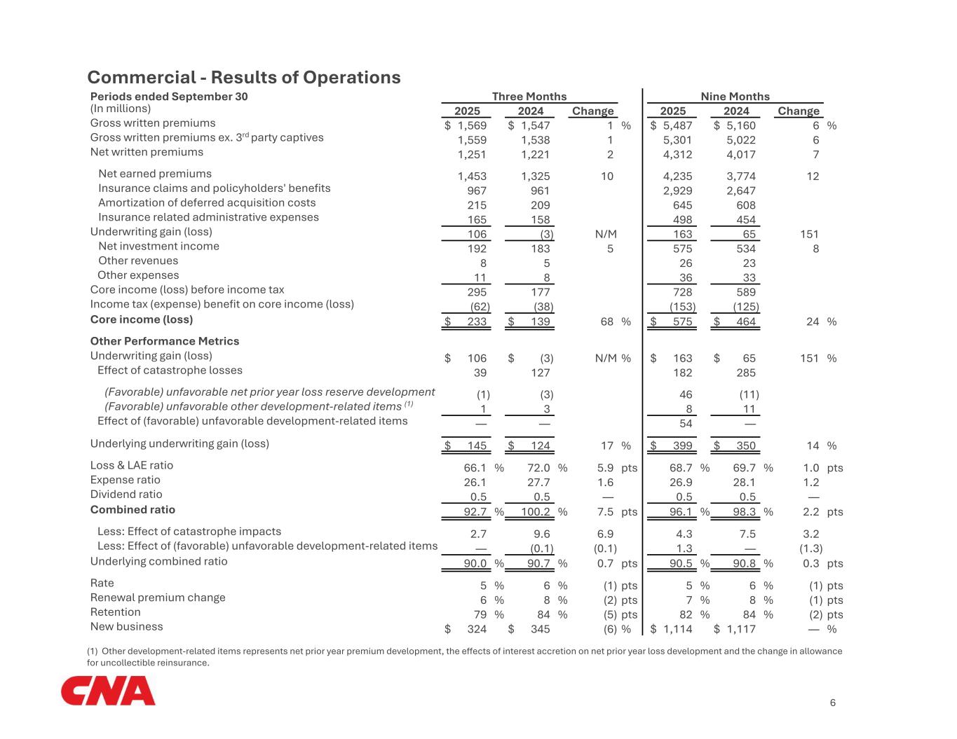 Commercial - Results of Operations Periods ended September 30 Three Months Nine Months (In millions) 2025 2024 Change 2025 2024 Change Gross written premiums $ 1,569 $ 1,547 1 % $ 5,487 $ 5,160 6 % Gross written premiums ex. 3rd party captives 1,559 1,538 1 5,301 5,022 6 Net written premiums 1,251 1,221 2 4,312 4,017 7 Net earned premiums 1,453 1,325 10 4,235 3,774 12 Insurance claims and policyholders' benefits 967 961 2,929 2,647 Amortization of deferred acquisition costs 215 209 645 608 Insurance related administrative expenses 165 158 498 454 Underwriting gain (loss) 106 (3) N/M 163 65 151 Net investment income 192 183 5 575 534 8 Other revenues 8 5 26 23 Other expenses 11 8 36 33 Core income (loss) before income tax 295 177 728 589 Income tax (expense) benefit on core income (loss) (62) (38) (153) (125) Core income (loss) $ 233 $ 139 68 % $ 575 $ 464 24 % Other Performance Metrics Underwriting gain (loss) $ 106 $ (3) N/M % $ 163 $ 65 151 % Effect of catastrophe losses 39 127 182 285 (Favorable) unfavorable net prior year loss reserve development (1) (3) 46 (11) (Favorable) unfavorable other development-related items (1) 1 3 8 11 Effect of (favorable) unfavorable development-related items — — 54 — Underlying underwriting gain (loss) $ 145 $ 124 17 % $ 399 $ 350 14 % Loss & LAE ratio 66.1 % 72.0 % 5.9 pts 68.7 % 69.7 % 1.0 pts Expense ratio 26.1 27.7 1.6 26.9 28.1 1.2 Dividend ratio 0.5 0.5 — 0.5 0.5 — Combined ratio 92.7 % 100.2 % 7.5 pts 96.1 % 98.3 % 2.2 pts Less: Effect of catastrophe impacts 2.7 9.6 6.9 4.3 7.5 3.2 Less: Effect of (favorable) unfavorable development-related items — (0.1) (0.1) 1.3 — (1.3) Underlying combined ratio 90.0 % 90.7 % 0.7 pts 90.5 % 90.8 % 0.3 pts Rate 5 % 6 % (1) pts 5 % 6 % (1) pts Renewal premium change 6 % 8 % (2) pts 7 % 8 % (1) pts Retention 79 % 84 % (5) pts 82 % 84 % (2) pts New business $ 324 $ 345 (6) % $ 1,114 $ 1,117 — % (1) Other development-related items represents net prior year premium development, the effects of interest accretion on net prior year loss development and the change in allowance for uncollectible reinsurance. 6