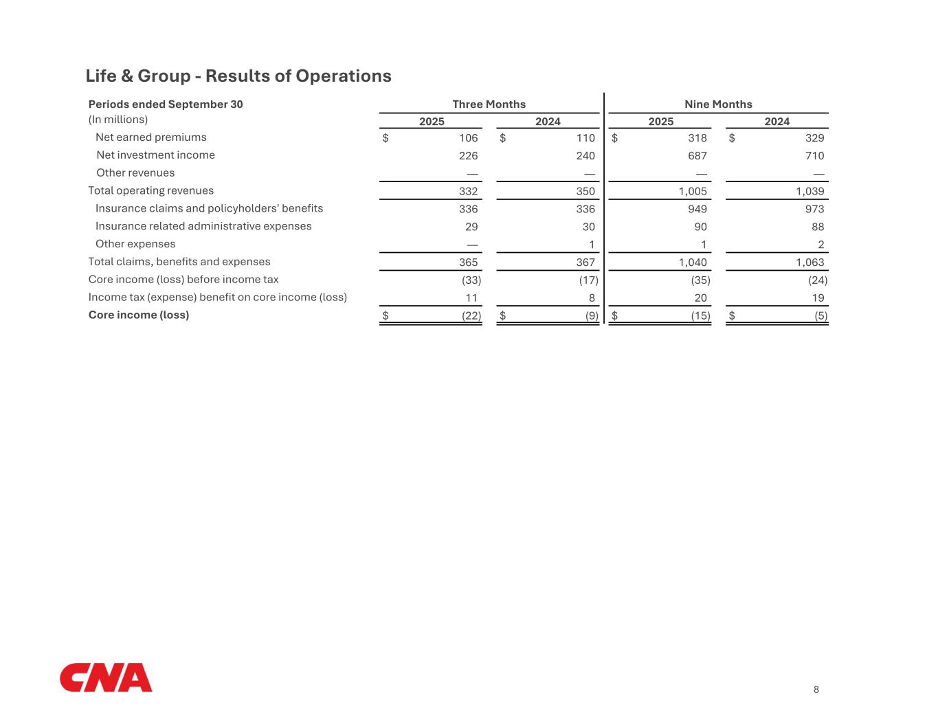 International - Results of Operations Periods ended September 30 Three Months Nine Months (In millions) 2025 2024 Change 2025 2024 Change Gross written premiums $ 322 $ 305 6 % $ 1,132 $ 1,096 3 % Net written premiums 319 277 15 976 896 9 Net earned premiums 344 311 11 978 937 4 Insurance claims and policyholders' benefits 203 195 590 568 Amortization of deferred acquisition costs 71 60 197 182 Insurance related administrative expenses 42 44 125 129 Underwriting gain (loss) 28 12 133 66 58 14 Net investment income 42 32 31 114 95 20 Other revenues — — — — Other expenses (1) (8) (12) (5) Core income (loss) before income tax 71 52 192 158 Income tax (expense) benefit on core income (loss) (24) (16) (55) (41) Core income (loss) $ 47 $ 36 31 % $ 137 $ 117 17 % Other Performance Metrics Underwriting gain (loss) $ 28 $ 12 133 % $ 66 $ 58 14 % Effect of catastrophe losses 2 16 18 28 (Favorable) unfavorable net prior year loss reserve development — (2) — (5) (Favorable) unfavorable other development-related items (1) — — — — Effect of (favorable) unfavorable development-related items — (2) — (5) Underlying underwriting gain (loss) $ 30 $ 26 15 % $ 84 $ 81 4 % Loss & LAE ratio 59.1 % 62.5 % 3.4 pts 60.3 % 60.6 % 0.3 pts Expense ratio 32.7 33.6 0.9 32.9 33.1 0.2 Dividend ratio — — — — — — Combined ratio 91.8 % 96.1 % 4.3 pts 93.2 % 93.7 % 0.5 pts Less: Effect of catastrophe impacts 0.6 5.1 4.5 1.8 3.0 1.2 Less: Effect of (favorable) unfavorable development-related items — (0.7) (0.7) — (0.5) (0.5) Underlying combined ratio 91.2 % 91.7 % 0.5 pts 91.4 % 91.2 % (0.2) pts Rate (6) % (2) % (4) pts (4) % — % (4) pts Renewal premium change (3) % 1 % (4) pts (1) % 2 % (3) pts Retention 83 % 82 % 1 pts 85 % 81 % 4 pts New business $ 94 $ 73 29 % $ 280 $ 213 31 % (1) Other development-related items represents net prior year premium development, the effects of interest accretion on net prior year loss development and the change in allowance for uncollectible reinsurance. 7