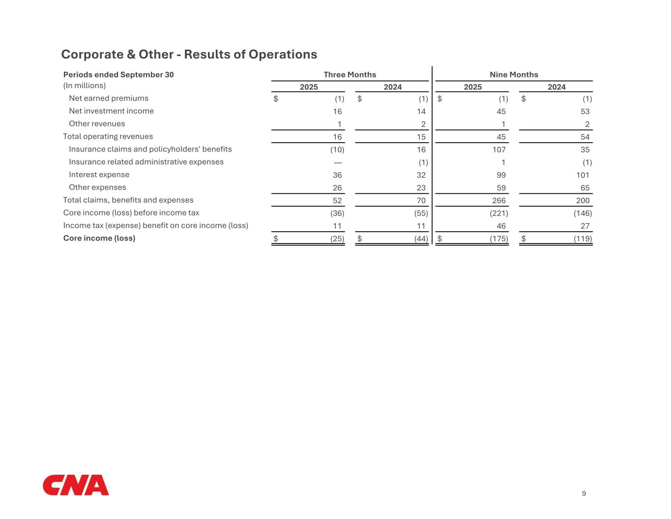 Life & Group - Results of Operations Periods ended September 30 Three Months Nine Months (In millions) 2025 2024 2025 2024 Net earned premiums $ 106 $ 110 $ 318 $ 329 Net investment income 226 240 687 710 Other revenues — — — — Total operating revenues 332 350 1,005 1,039 Insurance claims and policyholders' benefits 336 336 949 973 Insurance related administrative expenses 29 30 90 88 Other expenses — 1 1 2 Total claims, benefits and expenses 365 367 1,040 1,063 Core income (loss) before income tax (33) (17) (35) (24) Income tax (expense) benefit on core income (loss) 11 8 20 19 Core income (loss) $ (22) $ (9) $ (15) $ (5) 8