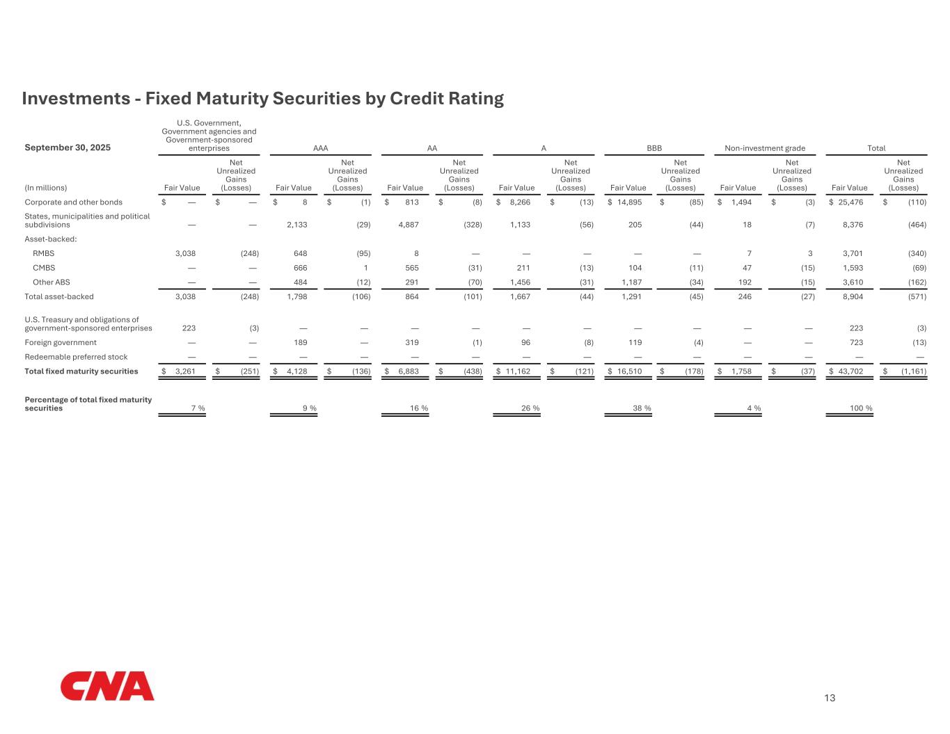 Investment Summary - Life & Group September 30, 2025 June 30, 2025 December 31, 2024 (In millions) Carrying Value Net Unrealized Gains (Losses) Carrying Value Net Unrealized Gains (Losses) Carrying Value Net Unrealized Gains (Losses) Fixed maturity securities: Corporate and other bonds $ 11,055 $ 45 $ 10,852 $ (196) $ 10,189 $ (344) States, municipalities and political subdivisions: Tax-exempt 2,147 112 2,078 59 2,184 141 Taxable 1,366 (68) 1,350 (93) 1,480 (98) Total states, municipalities and political subdivisions 3,513 44 3,428 (34) 3,664 43 Asset-backed: RMBS 2 — 2 — 2 — CMBS 22 (2) 22 (2) 22 (3) Other ABS 554 (98) 557 (106) 562 (110) Total asset-backed 578 (100) 581 (108) 586 (113) U.S. Treasury and obligations of government-sponsored enterprises 9 — 9 — 9 — Foreign government 48 (8) 46 (10) 46 (10) Redeemable preferred stock — — — — — — Total fixed maturity securities 15,203 (19) 14,916 (348) 14,494 (424) Equities: Common stock — — — — — — Non-redeemable preferred stock 337 — 346 — 364 — Total equities 337 — 346 — 364 — Limited partnership investments: Hedge funds 41 — 42 — 84 — Private equity funds 265 — 258 — 508 — Total limited partnership investments 306 — 300 — 592 — Other invested assets — — — — — — Mortgage loans 171 — 173 — 175 — Short-term investments 135 — 91 — 48 — Total investments $ 16,152 $ (19) $ 15,826 $ (348) $ 15,673 $ (424) Net receivable/(payable) on investment activity $ 4 $ (15) $ 9 Effective duration (in years) 9.8 9.8 9.8 Weighted average rating (1) A- A- A- (1) Obligations of the U.S. Government, U.S. Government agencies and U.S. Government-sponsored enterprises were classified as AAA for purposes of calculating the weighted average rating. 12