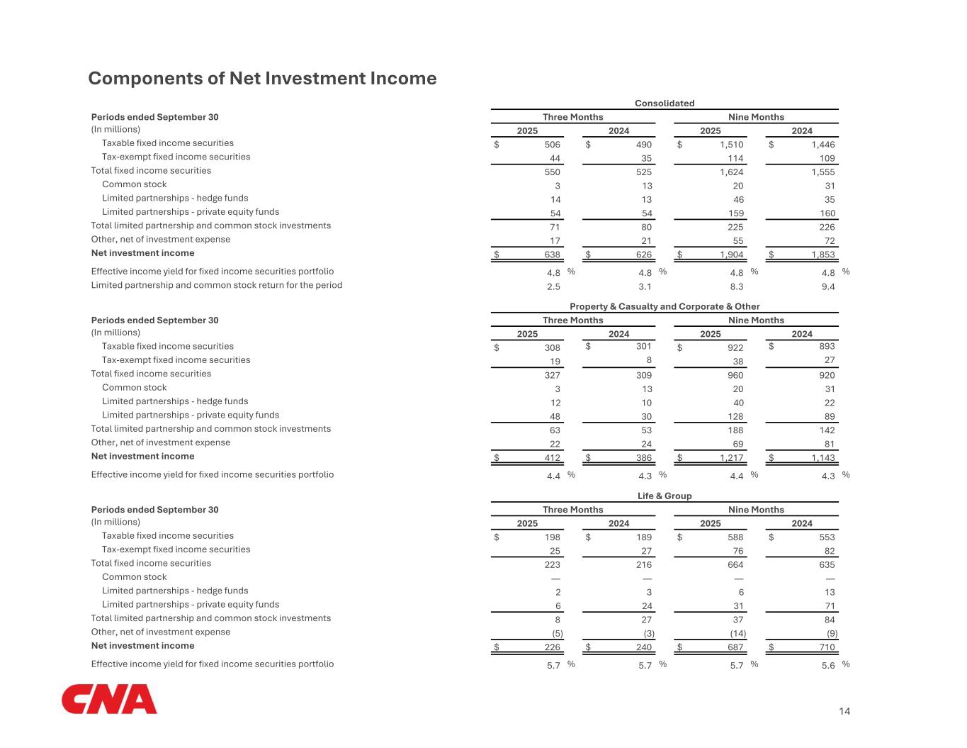Components of Net Investment Income Consolidated Periods ended September 30 Three Months Nine Months (In millions) 2025 2024 2025 2024 Taxable fixed income securities $ 506 $ 490 $ 1,510 $ 1,446 Tax-exempt fixed income securities 44 35 114 109 Total fixed income securities 550 525 1,624 1,555 Common stock 3 13 20 31 Limited partnerships - hedge funds 14 13 46 35 Limited partnerships - private equity funds 54 54 159 160 Total limited partnership and common stock investments 71 80 225 226 Other, net of investment expense 17 21 55 72 Net investment income $ 638 $ 626 $ 1,904 $ 1,853 Effective income yield for fixed income securities portfolio 4.8 % 4.8 % 4.8 % 4.8 % Limited partnership and common stock return for the period 2.5 3.1 8.3 9.4 Property & Casualty and Corporate & Other Periods ended September 30 Three Months Nine Months (In millions) 2025 2024 2025 2024 Taxable fixed income securities $ 308 $ 301 $ 922 $ 893 Tax-exempt fixed income securities 19 8 38 27 Total fixed income securities 327 309 960 920 Common stock 3 13 20 31 Limited partnerships - hedge funds 12 10 40 22 Limited partnerships - private equity funds 48 30 128 89 Total limited partnership and common stock investments 63 53 188 142 Other, net of investment expense 22 24 69 81 Net investment income $ 412 $ 386 $ 1,217 $ 1,143 Effective income yield for fixed income securities portfolio 4.4 % 4.3 % 4.4 % 4.3 % Life & Group Periods ended September 30 Three Months Nine Months (In millions) 2025 2024 2025 2024 Taxable fixed income securities $ 198 $ 189 $ 588 $ 553 Tax-exempt fixed income securities 25 27 76 82 Total fixed income securities 223 216 664 635 Common stock — — — — Limited partnerships - hedge funds 2 3 6 13 Limited partnerships - private equity funds 6 24 31 71 Total limited partnership and common stock investments 8 27 37 84 Other, net of investment expense (5) (3) (14) (9) Net investment income $ 226 $ 240 $ 687 $ 710 Effective income yield for fixed income securities portfolio 5.7 % 5.7 % 5.7 % 5.6 % 14