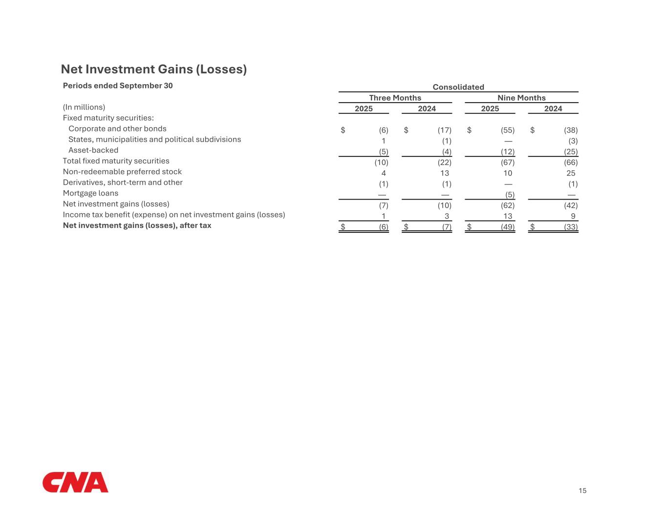 Net Investment Gains (Losses) Periods ended September 30 Consolidated Three Months Nine Months (In millions) 2025 2024 2025 2024 Fixed maturity securities: Corporate and other bonds $ (6) $ (17) $ (55) $ (38) States, municipalities and political subdivisions 1 (1) — (3) Asset-backed (5) (4) (12) (25) Total fixed maturity securities (10) (22) (67) (66) Non-redeemable preferred stock 4 13 10 25 Derivatives, short-term and other (1) (1) — (1) Mortgage loans — — (5) — Net investment gains (losses) (7) (10) (62) (42) Income tax benefit (expense) on net investment gains (losses) 1 3 13 9 Net investment gains (losses), after tax $ (6) $ (7) $ (49) $ (33) 15