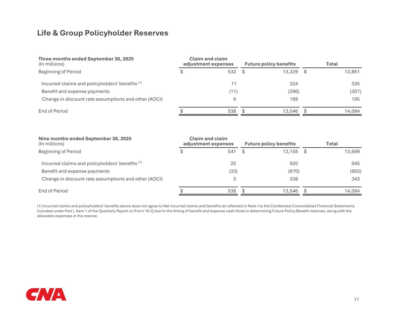 Life & Group Policyholder Reserves Three months ended September 30, 2025 (In millions) Claim and claim adjustment expenses Future policy benefits Total Beginning of Period $ 532 $ 13,329 $ 13,861 Incurred claims and policyholders' benefits (1) 11 324 335 Benefit and expense payments (11) (296) (307) Change in discount rate assumptions and other (AOCI) 6 189 195 End of Period $ 538 $ 13,546 $ 14,084 Nine months ended September 30, 2025 (In millions) Claim and claim adjustment expenses Future policy benefits Total Beginning of Period $ 541 $ 13,158 $ 13,699 Incurred claims and policyholders' benefits (1) 25 920 945 Benefit and expense payments (33) (870) (903) Change in discount rate assumptions and other (AOCI) 5 338 343 End of Period $ 538 $ 13,546 $ 14,084 (1) Incurred claims and policyholders' benefits above does not agree to Net incurred claims and benefits as reflected in Note J to the Condensed Consolidated Financial Statements included under Part I, Item 1 of the Quarterly Report on Form 10-Q due to the timing of benefit and expense cash flows in determining Future Policy Benefit reserves, along with the allowable expenses in the reserve. 17