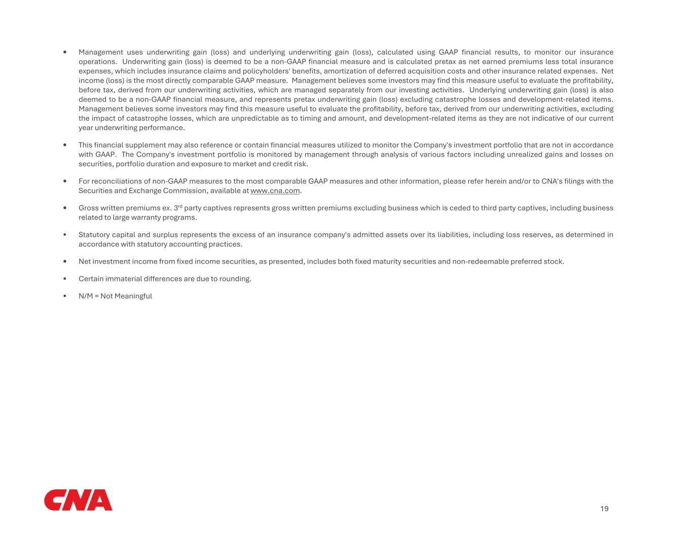 Definitions and Presentation • Collectively, CNA Financial Corporation (CNAF) and its subsidiaries are referred to as CNA or the Company. • P&C Operations includes Specialty, Commercial and International. • Life & Group segment includes the individual and group run-off long-term care businesses as well as structured settlement obligations not funded by annuities related to certain property and casualty claimants. • Corporate & Other segment primarily includes certain corporate expenses, including interest on corporate debt, and the results of certain property and casualty business in run-off, including CNA Re, asbestos and environmental pollution (A&EP), a legacy portfolio of excess workers' compensation (EWC) policies and certain legacy mass tort reserves. • Management uses the core income (loss) financial measure to monitor the Company’s operations for the Specialty, Commercial and International segments. Core income (loss) is calculated by excluding from net income (loss) the after-tax effects of net investment gains or losses and gains or losses resulting from pension settlement transactions. Net investment gains or losses are excluded from the calculation of core income (loss) because they are generally driven by economic factors that are not necessarily reflective of our primary operations. The calculation of core income (loss) excludes gains or losses resulting from pension settlement transactions as they result from decisions regarding our defined benefit pension plans which are unrelated to our primary operations. Management monitors core income (loss) for each business segment to assess segment performance. Presentation of consolidated core income (loss) is deemed to be a non-GAAP financial measure and management believes some investors may find this measure useful to evaluate the Company's primary operations. Please refer to Note P to the Consolidated Financial Statements within the December 31, 2024 Form 10-K for further discussion regarding how the Company manages its business. • In evaluating the results of the Specialty, Commercial and International segments, management uses the loss ratio, the underlying loss ratio, the expense ratio, the dividend ratio, the combined ratio and the underlying combined ratio. These ratios are calculated using financial results prepared in accordance with accounting principles generally accepted in the United States of America. The loss ratio is the percentage of net incurred claim and claim adjustment expenses to net earned premiums. The underlying loss ratio excludes the impact of catastrophe losses and development-related items from the loss ratio. Development-related items represents net prior year loss reserve and premium development, and includes the effects of interest accretion and change in allowance for uncollectible reinsurance. The expense ratio is the percentage of insurance underwriting and acquisition expenses, including the amortization of deferred acquisition costs, to net earned premiums. The dividend ratio is the ratio of policyholders' dividends incurred to net earned premiums. The combined ratio is the sum of the loss ratio, the expense ratio and the dividend ratio. The underlying combined ratio is the sum of the underlying loss ratio, the expense ratio and the dividend ratio. The underlying loss ratio and the underlying combined ratio are deemed to be non-GAAP financial measures, and management believes some investors may find these ratios useful to evaluate our underwriting performance since they remove the impact of catastrophe losses, which are unpredictable as to timing and amount, and development-related items as they are not indicative of our current year underwriting performance. In addition, management also utilizes renewal premium change, rate, retention and new business in evaluating operating trends. Renewal premium change represents the estimated change in average premium on policies that renew, including rate and exposure changes. Rate represents the average change in price on policies that renew excluding exposure change. Exposure represents the measure of risk used in the pricing of the insurance product. The change in exposure represents the change in premium dollars on policies that renew as a result of the change in risk of the policy. Retention represents the percentage of premium dollars renewed, excluding rate and exposure changes, in comparison to the expiring premium dollars from policies available to renew. New business represents premiums from policies written with new customers and additional policies written with existing customers. 18