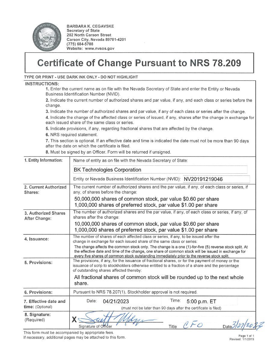 EX-3.1 2 bkti_ex31.htm CERTIFICATE OF CHANGE PURSUANT bkti_ex31.htm