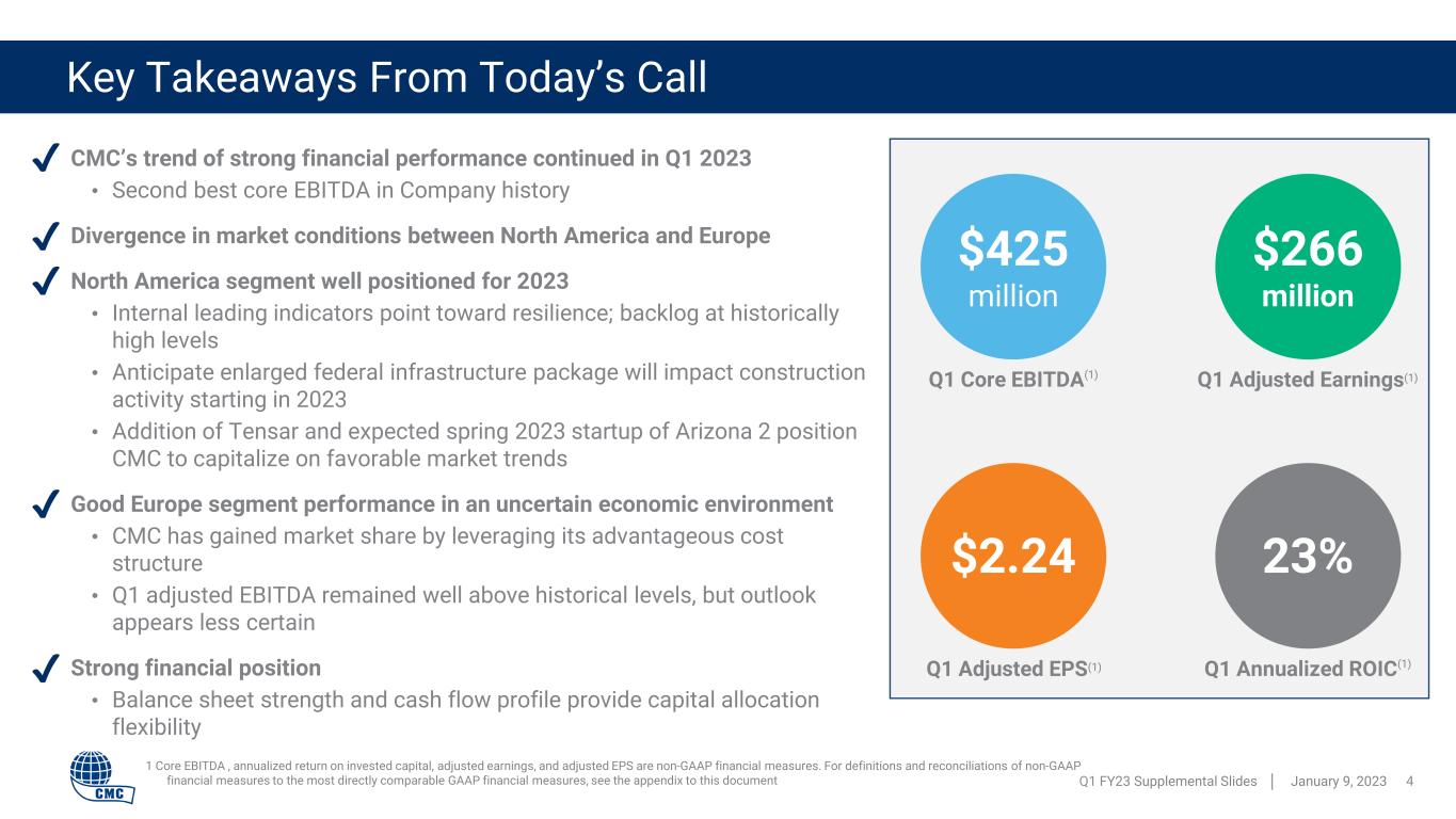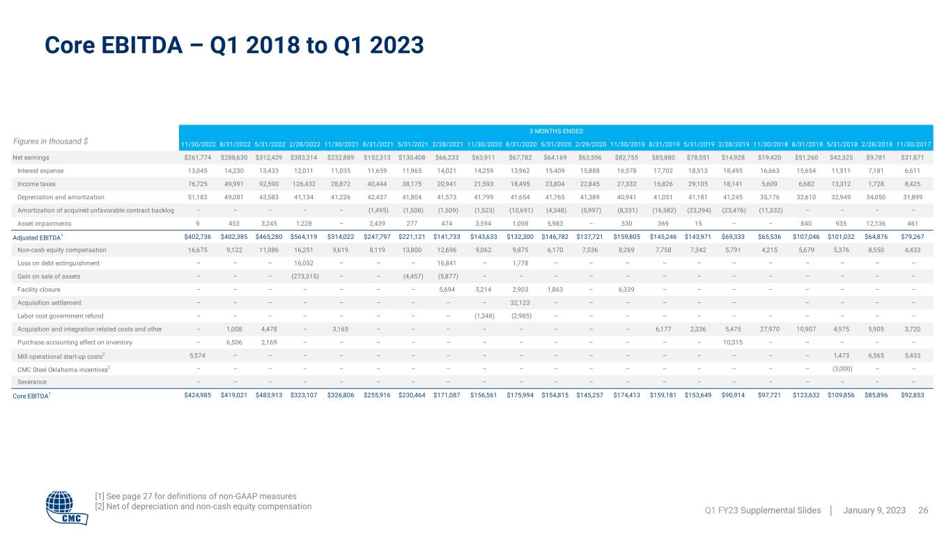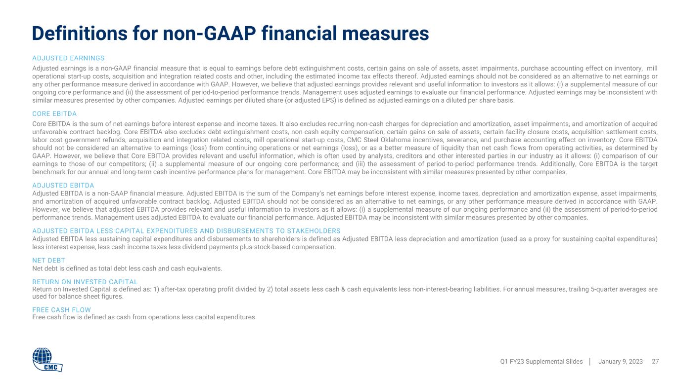 Definitions for non-GAAP financial measures Q1 FY23 Supplemental Slides │ January 9, 2023 27 ADJUSTED EARNINGS Adjusted earnings is a non-GAAP financial measure that is equal to earnings before debt extinguishment costs, certain gains on sale of assets, asset impairments, purchase accounting effect on inventory, mill operational start-up costs, acquisition and integration related costs and other, including the estimated income tax effects thereof. Adjusted earnings should not be considered as an alternative to net earnings or any other performance measure derived in accordance with GAAP. However, we believe that adjusted earnings provides relevant and useful information to investors as it allows: (i) a supplemental measure of our ongoing core performance and (ii) the assessment of period-to-period performance trends. Management uses adjusted earnings to evaluate our financial performance. Adjusted earnings may be inconsistent with similar measures presented by other companies. Adjusted earnings per diluted share (or adjusted EPS) is defined as adjusted earnings on a diluted per share basis. CORE EBITDA Core EBITDA is the sum of net earnings before interest expense and income taxes. It also excludes recurring non-cash charges for depreciation and amortization, asset impairments, and amortization of acquired unfavorable contract backlog. Core EBITDA also excludes debt extinguishment costs, non-cash equity compensation, certain gains on sale of assets, certain facility closure costs, acquisition settlement costs, labor cost government refunds, acquisition and integration related costs, mill operational start-up costs, CMC Steel Oklahoma incentives, severance, and purchase accounting effect on inventory. Core EBITDA should not be considered an alternative to earnings (loss) from continuing operations or net earnings (loss), or as a better measure of liquidity than net cash flows from operating activities, as determined by GAAP. However, we believe that Core EBITDA provides relevant and useful information, which is often used by analysts, creditors and other interested parties in our industry as it allows: (i) comparison of our earnings to those of our competitors; (ii) a supplemental measure of our ongoing core performance; and (iii) the assessment of period-to-period performance trends. Additionally, Core EBITDA is the target benchmark for our annual and long-term cash incentive performance plans for management. Core EBITDA may be inconsistent with similar measures presented by other companies. ADJUSTED EBITDA Adjusted EBITDA is a non-GAAP financial measure. Adjusted EBITDA is the sum of the Company’s net earnings before interest expense, income taxes, depreciation and amortization expense, asset impairments, and amortization of acquired unfavorable contract backlog. Adjusted EBITDA should not be considered as an alternative to net earnings, or any other performance measure derived in accordance with GAAP. However, we believe that adjusted EBITDA provides relevant and useful information to investors as it allows: (i) a supplemental measure of our ongoing performance and (ii) the assessment of period-to-period performance trends. Management uses adjusted EBITDA to evaluate our financial performance. Adjusted EBITDA may be inconsistent with similar measures presented by other companies. ADJUSTED EBITDA LESS CAPITAL EXPENDITURES AND DISBURSEMENTS TO STAKEHOLDERS Adjusted EBITDA less sustaining capital expenditures and disbursements to shareholders is defined as Adjusted EBITDA less depreciation and amortization (used as a proxy for sustaining capital expenditures) less interest expense, less cash income taxes less dividend payments plus stock-based compensation. NET DEBT Net debt is defined as total debt less cash and cash equivalents. RETURN ON INVESTED CAPITAL Return on Invested Capital is defined as: 1) after-tax operating profit divided by 2) total assets less cash & cash equivalents less non-interest-bearing liabilities. For annual measures, trailing 5-quarter averages are used for balance sheet figures. FREE CASH FLOW Free cash flow is defined as cash from operations less capital expenditures